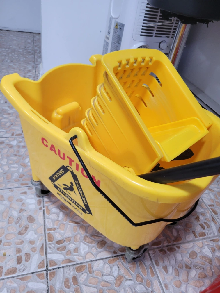 Selling a yellow mop bucket It comes with a wringer and is on wheels for easy movement. Perfect for keeping your floors clean!