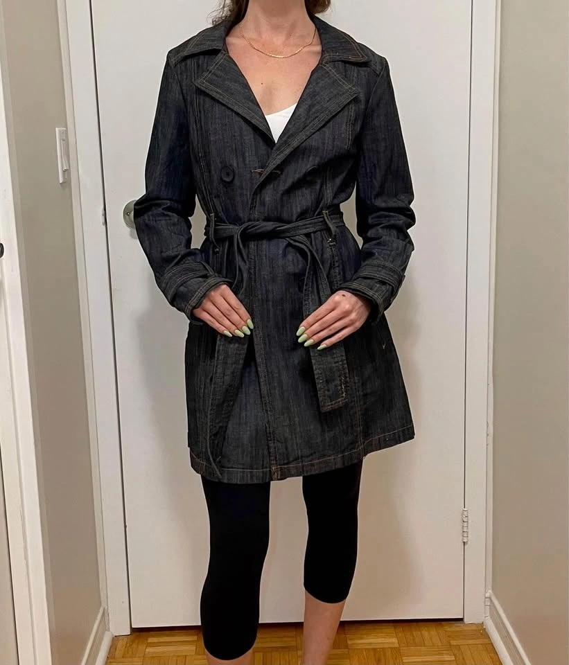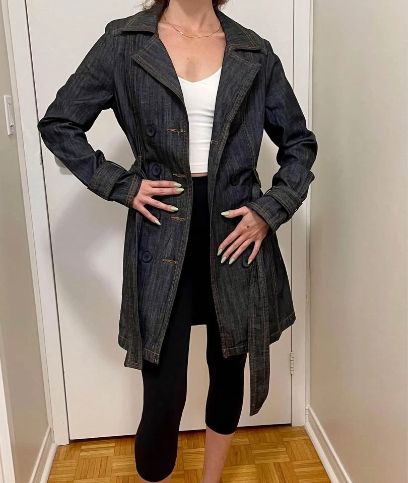 Excellent condition. Long dark wash trench Jean jacket with buttons and belt. Size large. Pick up East York