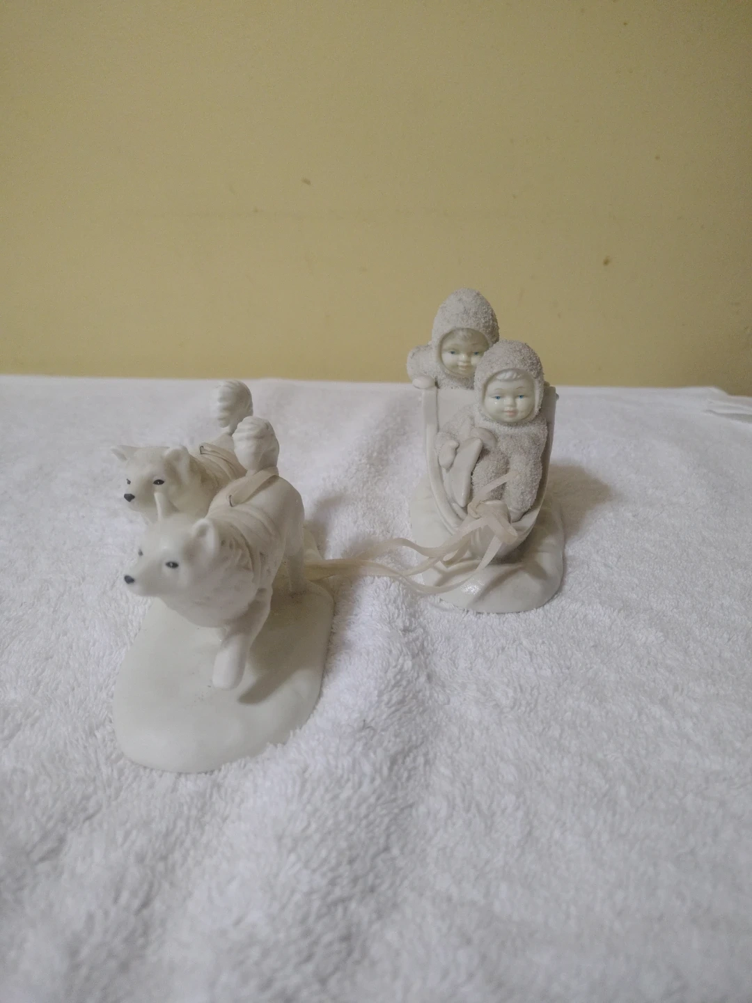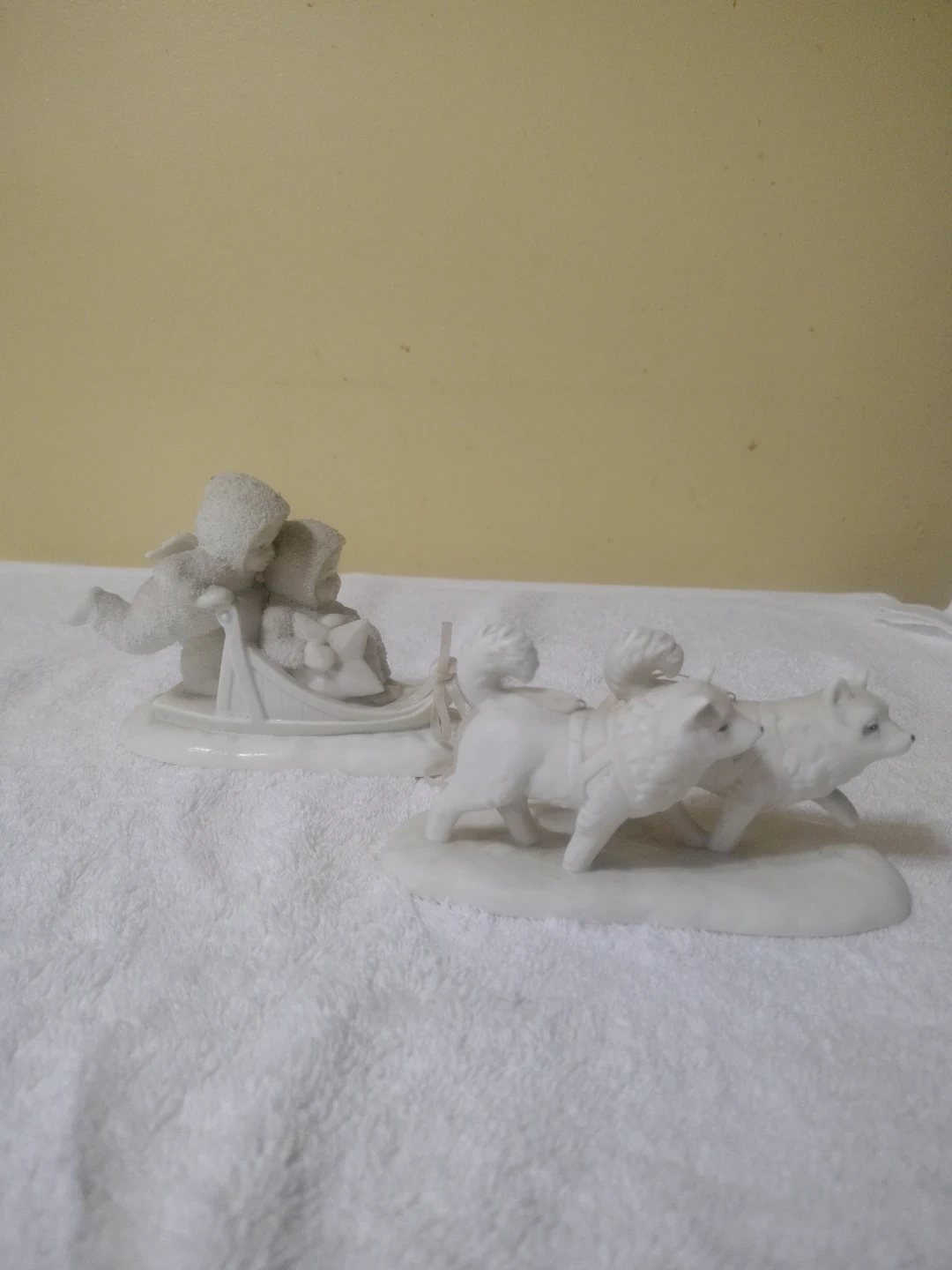 Selling a set of vintage porcelain figurines. One features two angels in a sled, and the other shows three dogs pulling a sled. They're a charming addition to any collection or decor