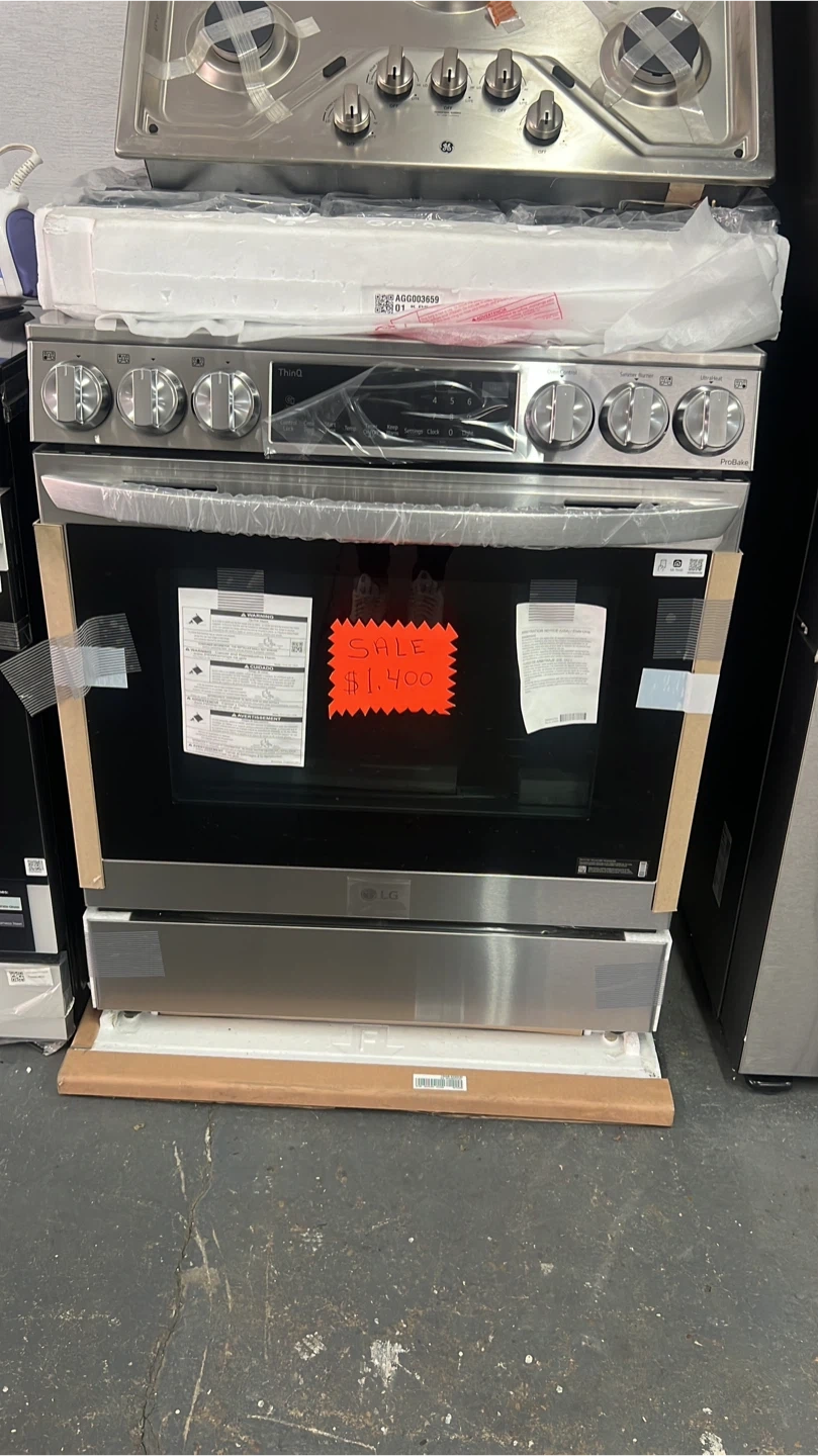 Selling an LG ThinQ ProBake oven in stainless steel! It's still in its original packaging. The sale price tag indicates it was $1,400.