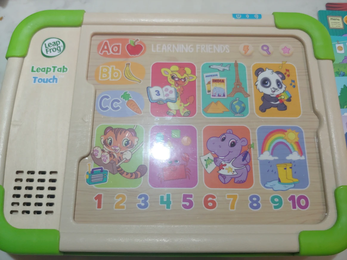 I'm selling a LeapFrog LeapTab Touch learning tablet! It's in great condition. It comes with several learning cards to teach your little one about letters, numbers, animals, and more. The cards can be locked into the pocket at the back. This was not used very much.