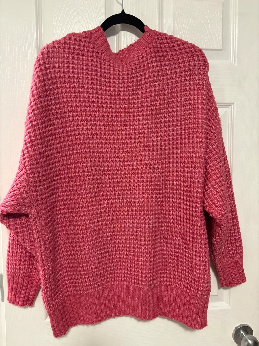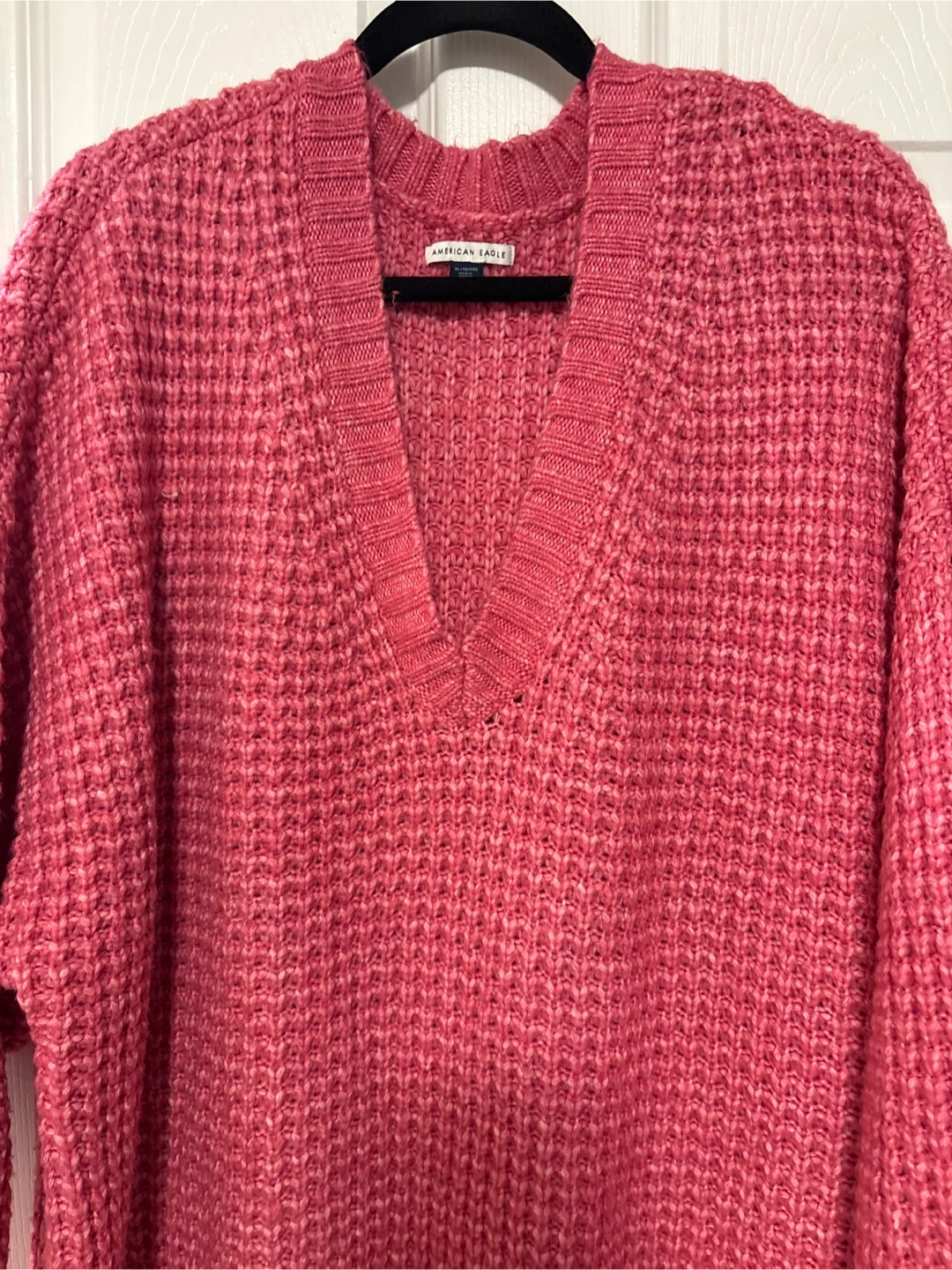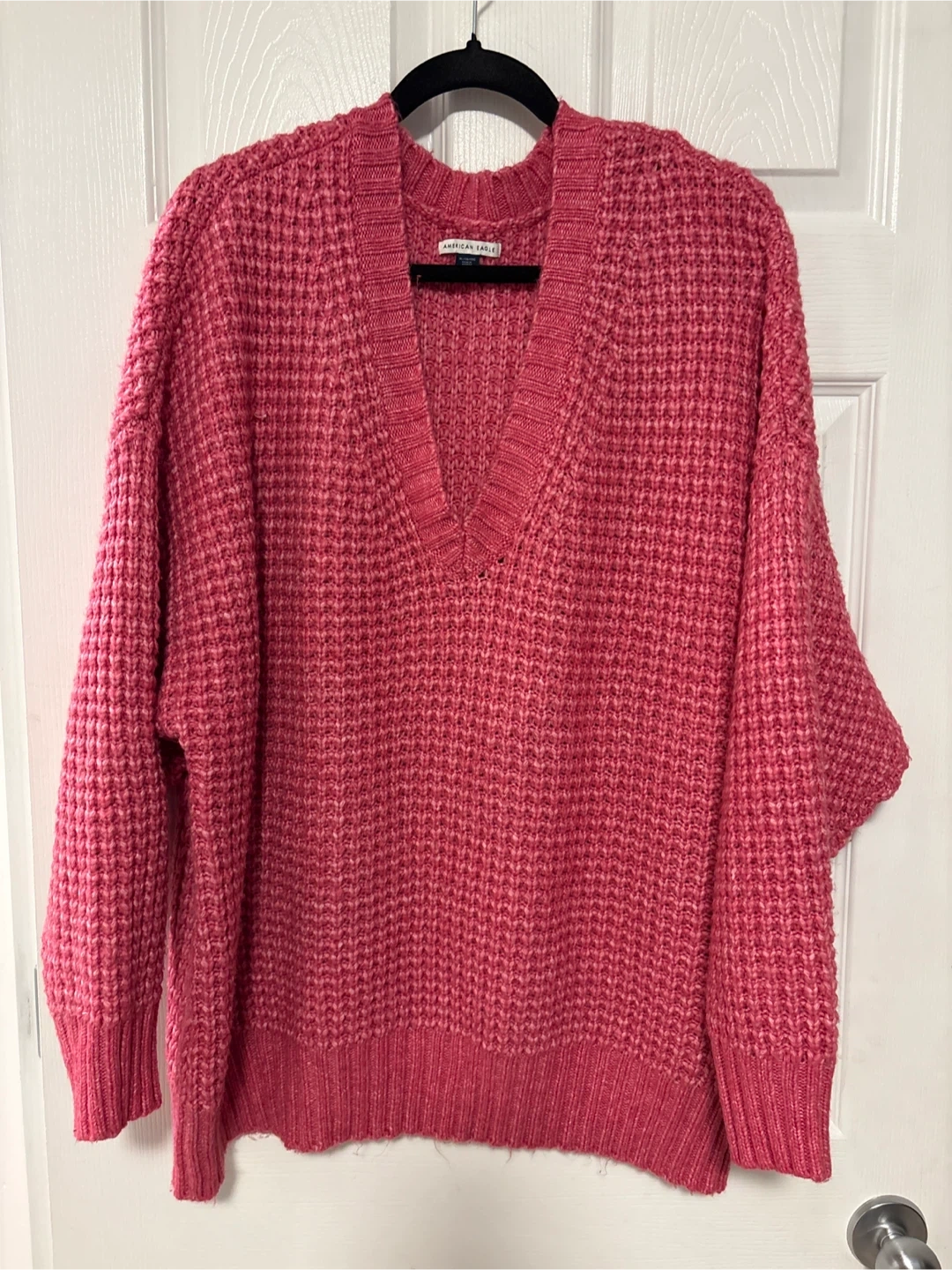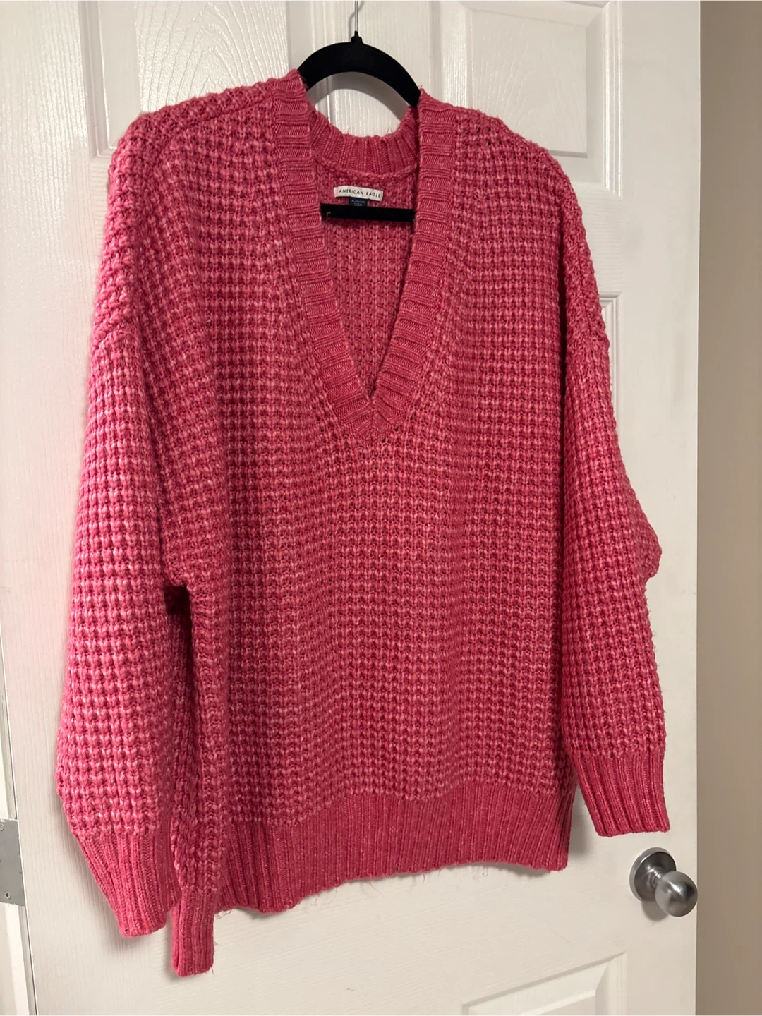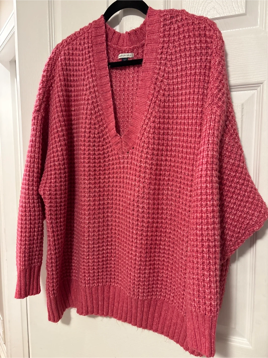 Cozy up in this lovely pink V-neck sweater from American Eagle! It's an XL size, perfect for a comfy, oversized fit. The material is soft and warm, great for those chilly days. Pick up walnut grove Langley