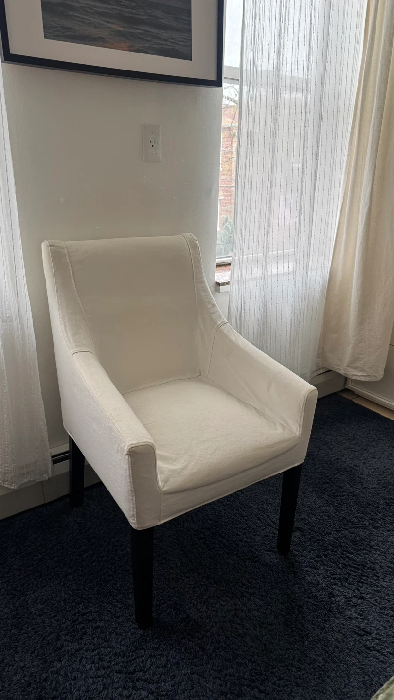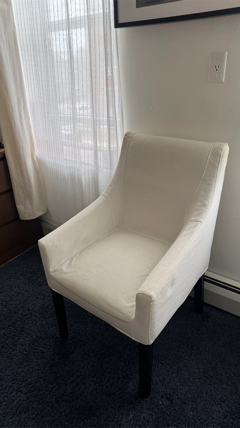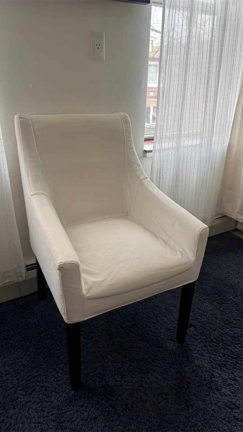 Selling a comfy upholstered armchair. It's in great shape and ready to add some style to your space! The chair features a classic design with clean lines and a neutral ivory white color that will easily match any decor.