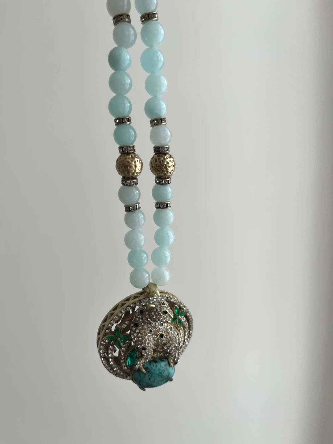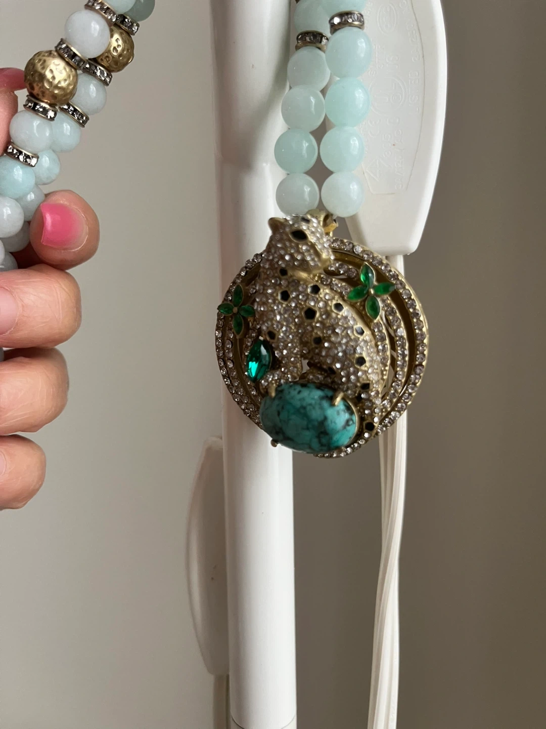 This is a lovely beaded necklace with a unique leopard pendant. The beads are a soft, light blue colour, complemented by gold accents and a detailed leopard design. The pendant features rhinestones and green accents, including a turquoise-coloured stone at the base. It's a beautiful statement piece!