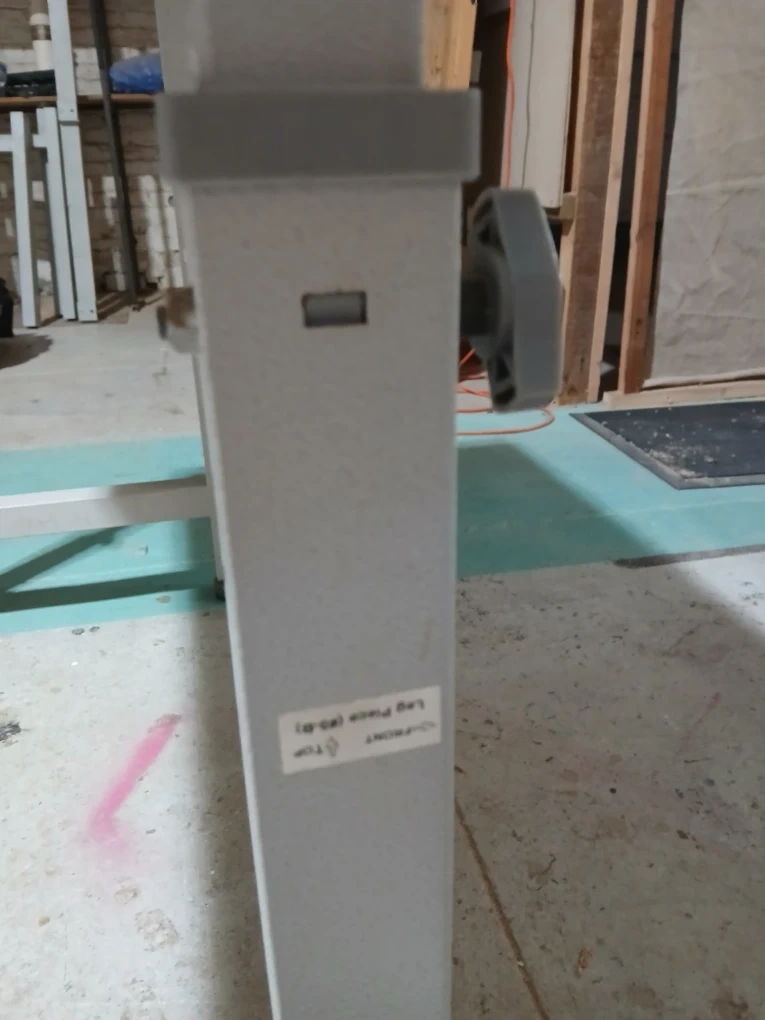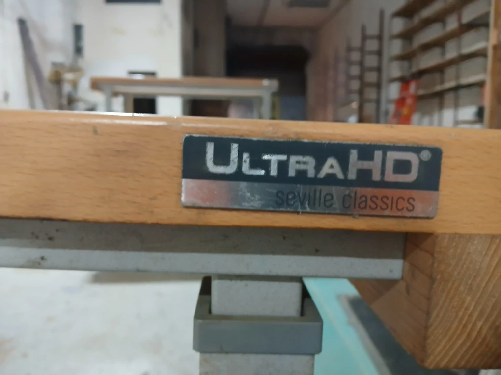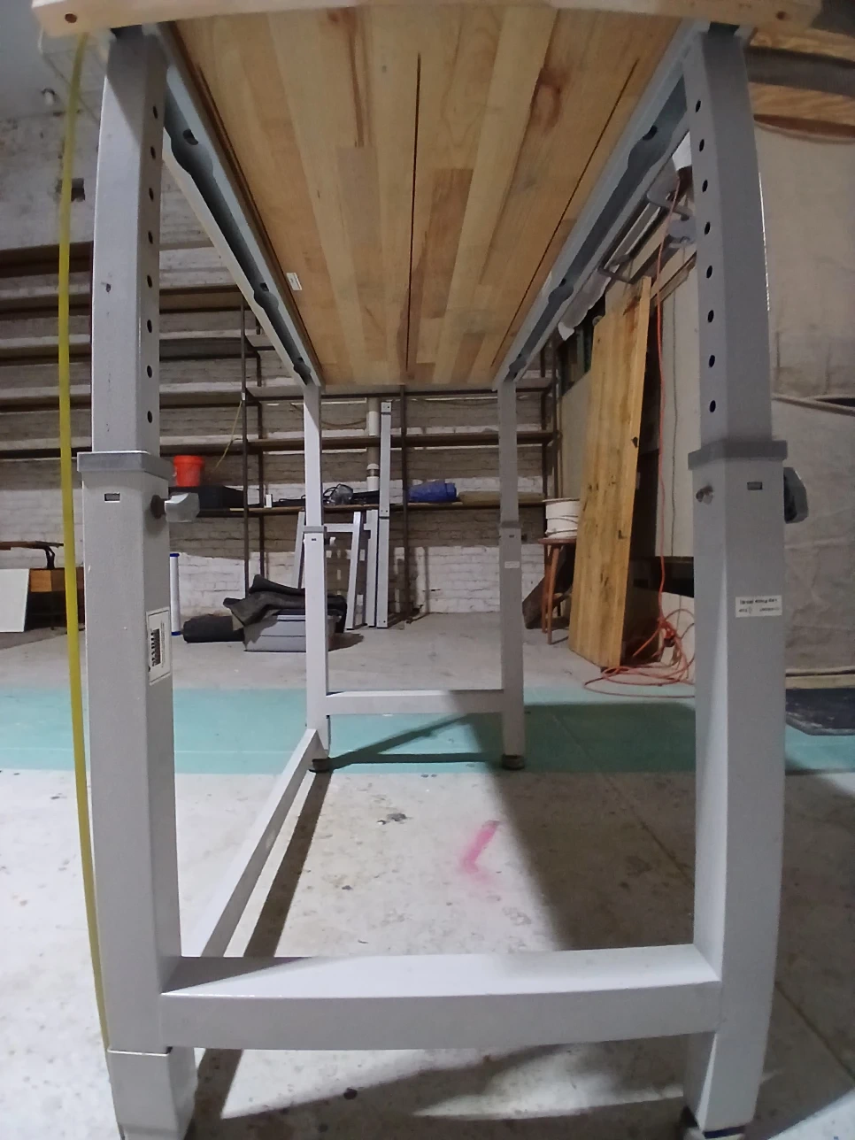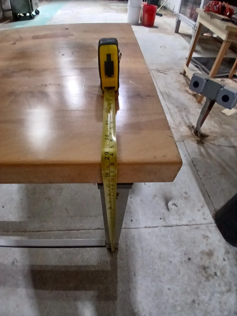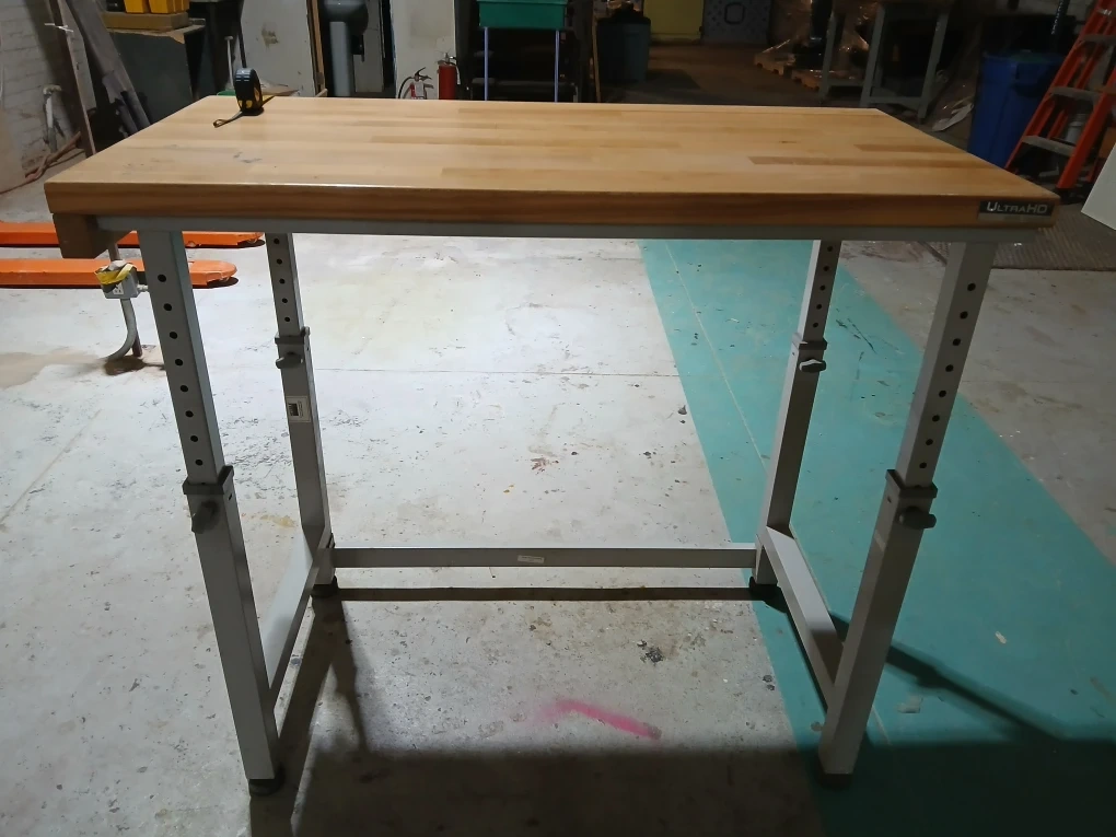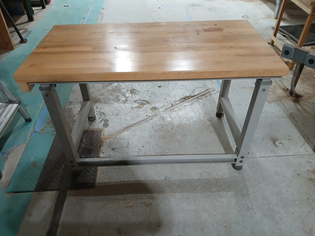 Selling an adjustable height work table. It appears to be in good condition and ready for a new workshop or workspace. The tabletop measures approximately 60 inches in length and 30 inches in width.