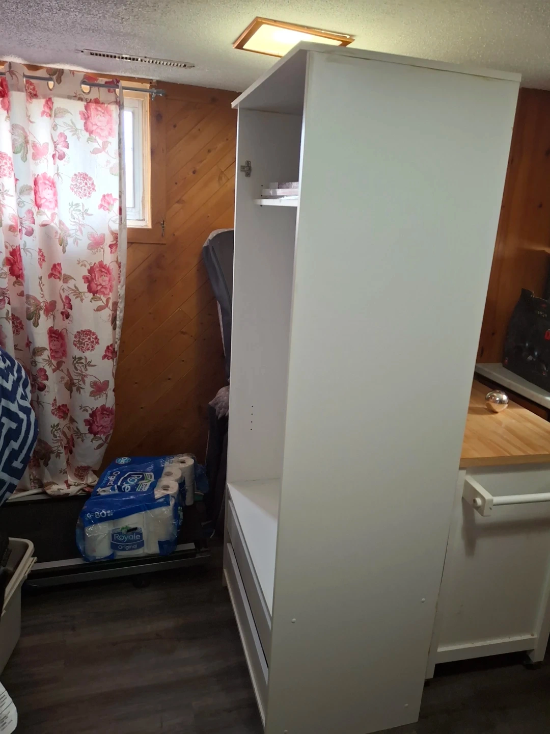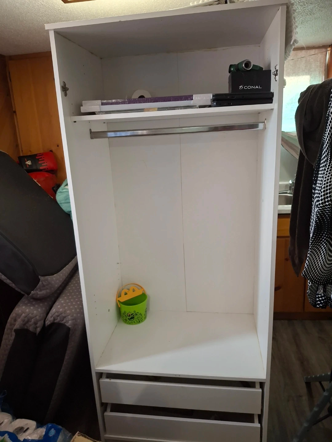 Here's a white wardrobe that could be perfect for adding some extra storage space! It features a hanging rod and drawers at the bottom. Great for organizing clothes and accessories! it don't have door's