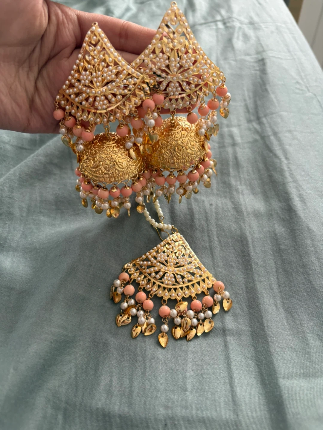 These are beautiful gold-toned jhumka earrings. They feature intricate detailing, with accents of pearls and peach-coloured beads. Perfect for adding a touch of elegance to any outfit!