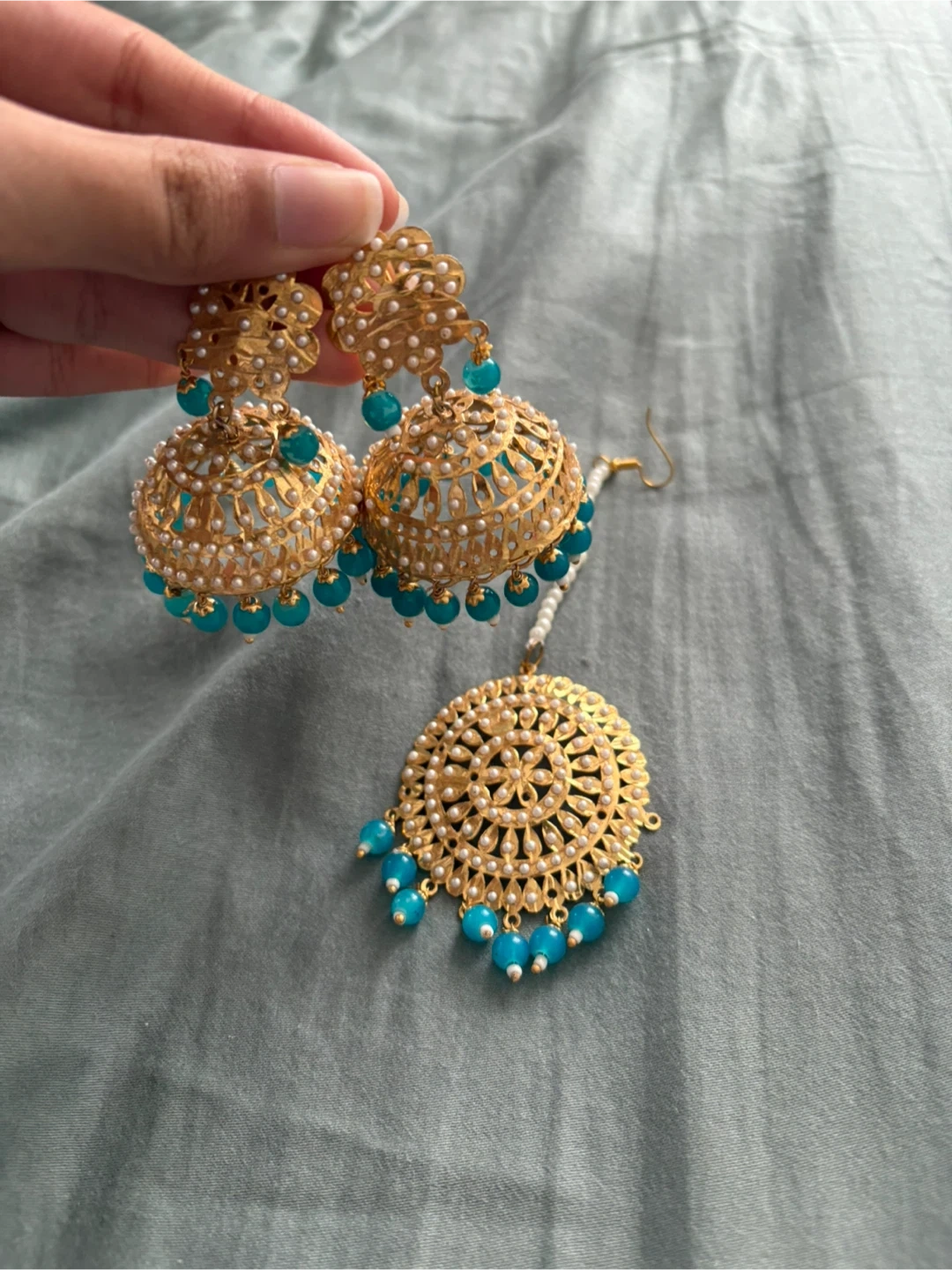 Beautiful gold jhumka earrings with a matching tikka set! The earrings feature intricate designs with pearl and turquoise bead accents. Perfect for adding a touch of elegance to any outfit.