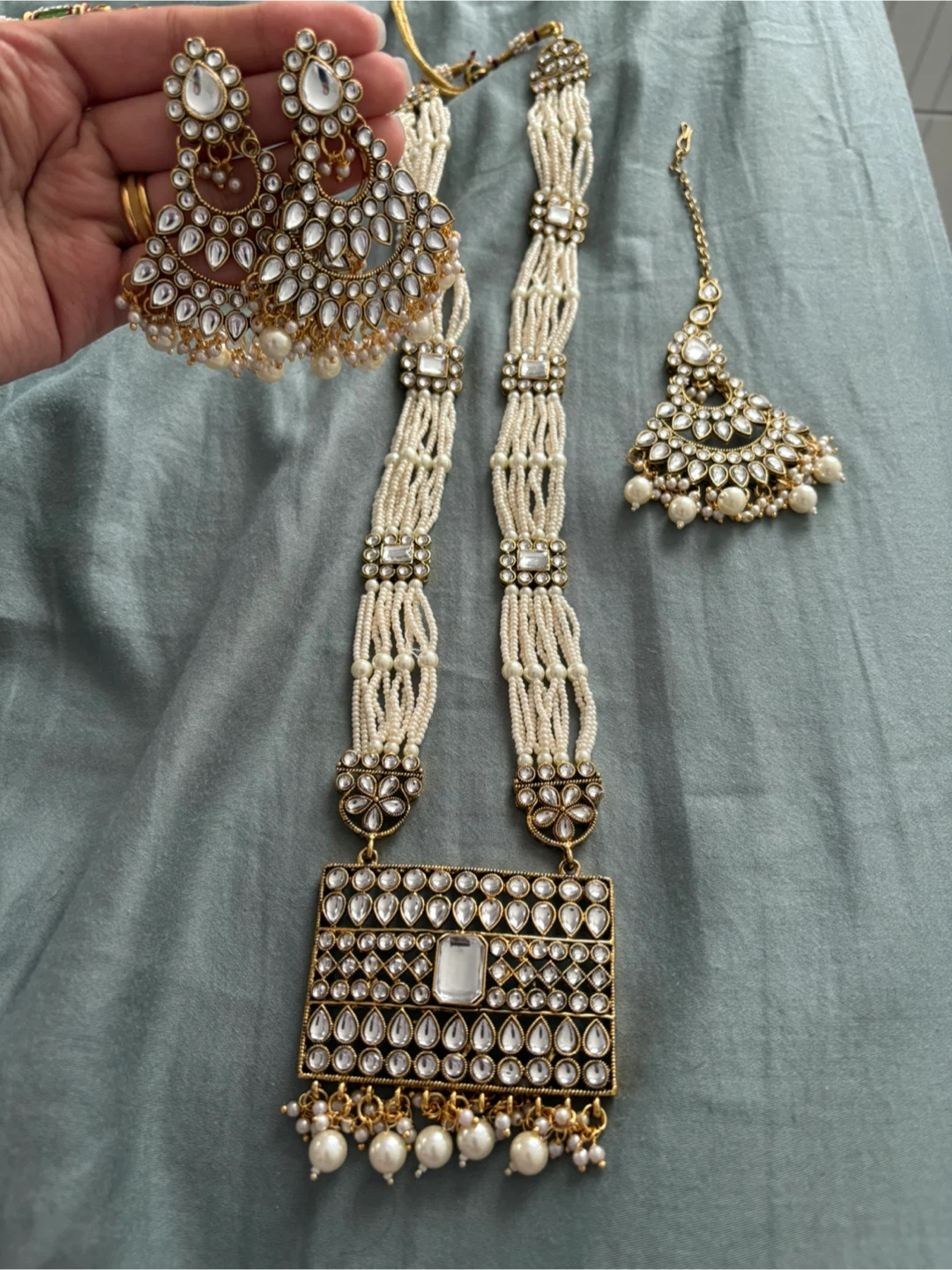 Beautiful Indian jewelry set featuring a necklace, earrings, and tikka. The set has a gold tone with white pearl-like accents. Perfect for special occasions!