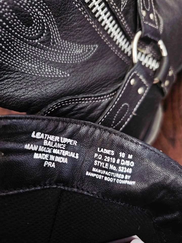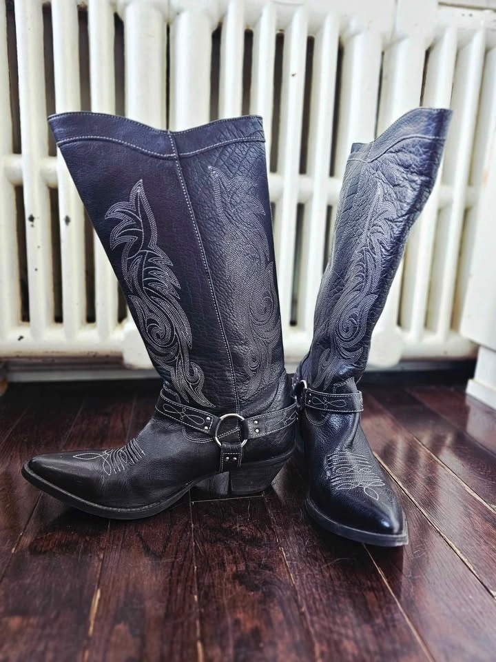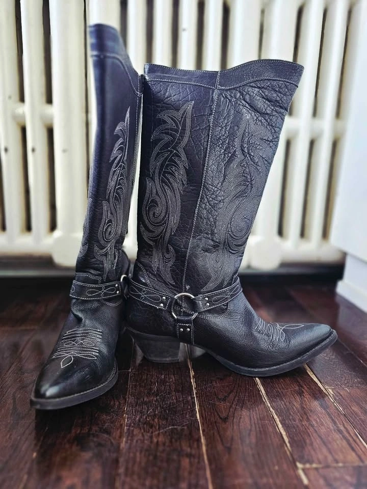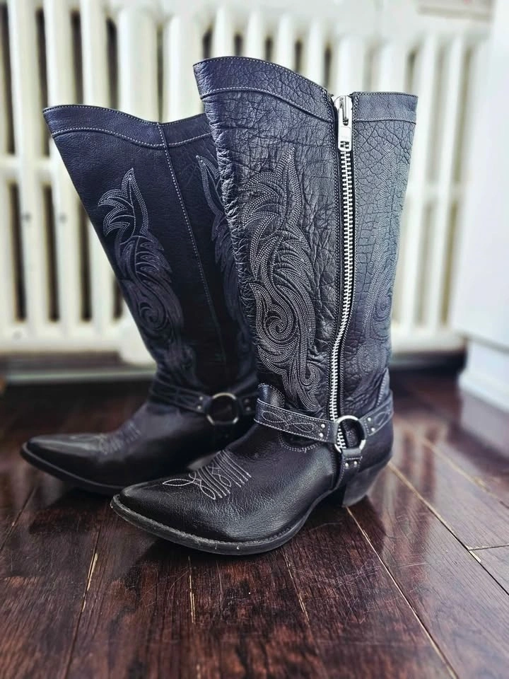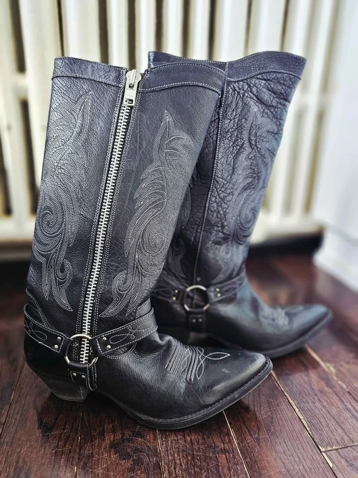 Striking extra tall Diamante cowboy boots from the reputable brand Laredo, in black genuine leather with grey monochromatic embroidered stitching. Boots have a built-in moto style O-ring harness and close with a heavy duty silver tone full-length statement zipper. Pointed or snip toe style. They are more fitted around the calf than a typical cowboy boot for a slimmer silhouette, making them perfect for wearing with skirts or dresses!