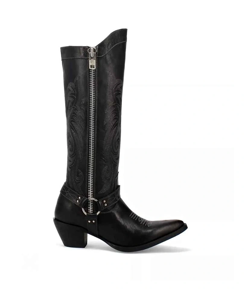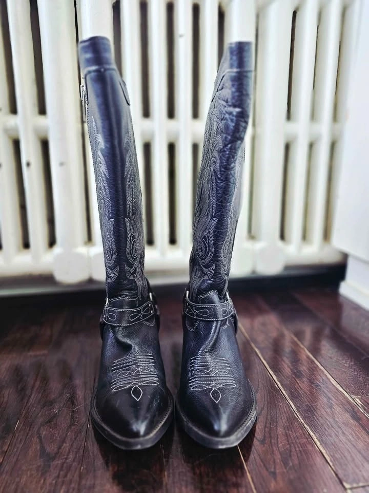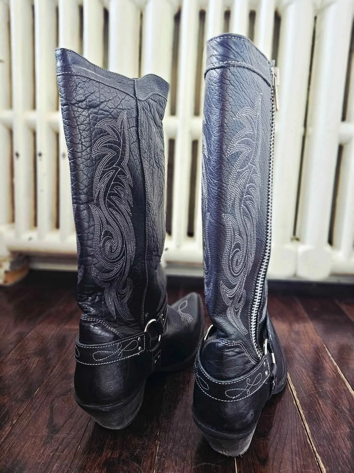 Striking extra tall Diamante cowboy boots from the reputable brand Laredo, in black genuine leather with grey monochromatic embroidered stitching. Boots have a built-in moto style O-ring harness and close with a heavy duty silver tone full-length statement zipper. Pointed or snip toe style. They are more fitted around the calf than a typical cowboy boot for a slimmer silhouette, making them perfect for wearing with skirts or dresses!
