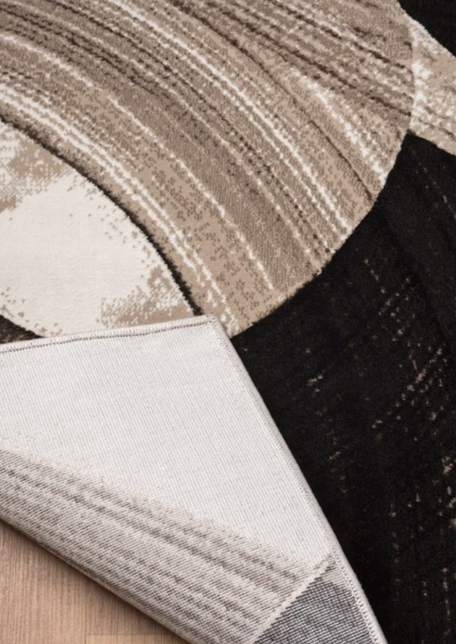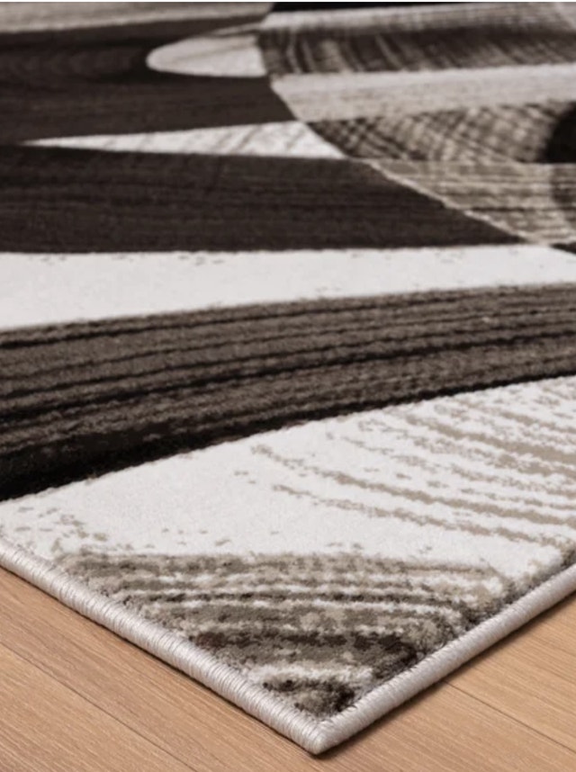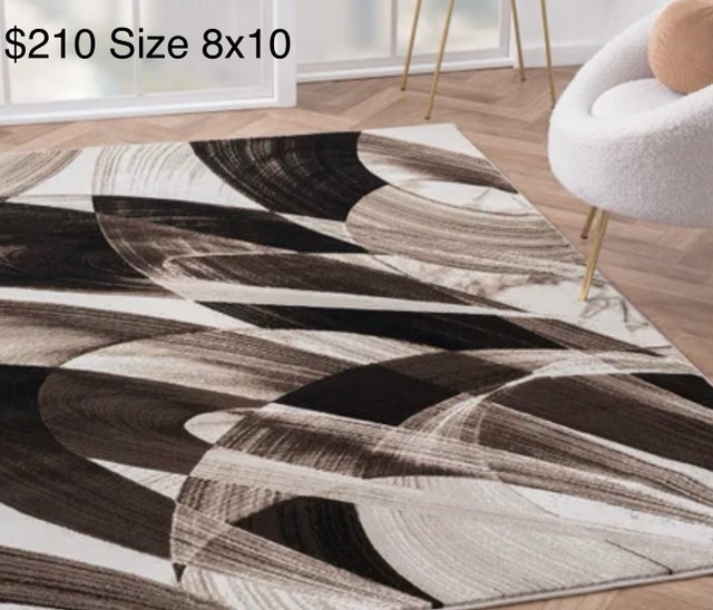 Add a touch of modern elegance to your space with this stylish 8x10 area rug, showcasing an abstract pattern in neutral tones; new condition Here are the specifications: * Size: 8 feet by 10 feet * Style: Abstract * Colour Palette: Neutral tones (Black, White, Grey, Pickup from Ajax