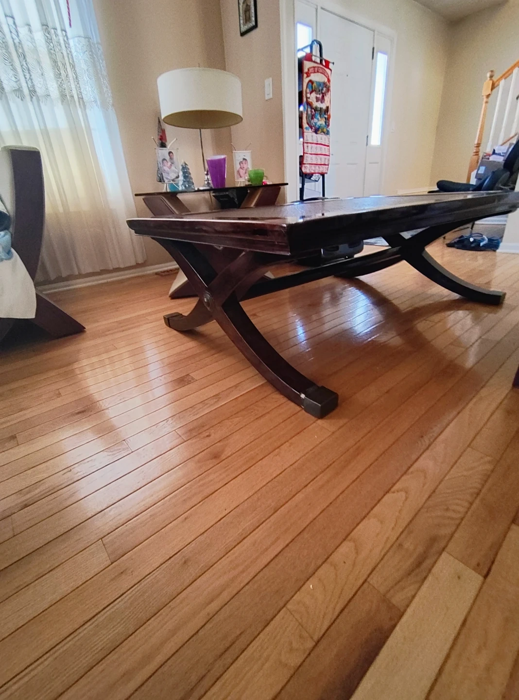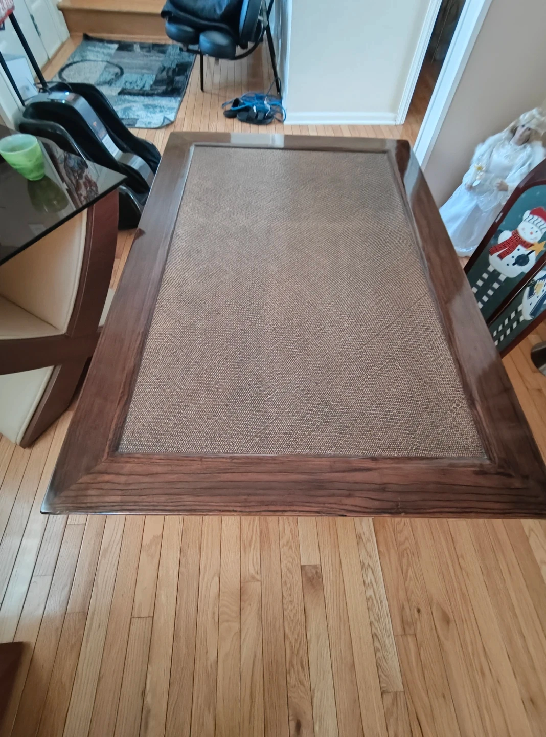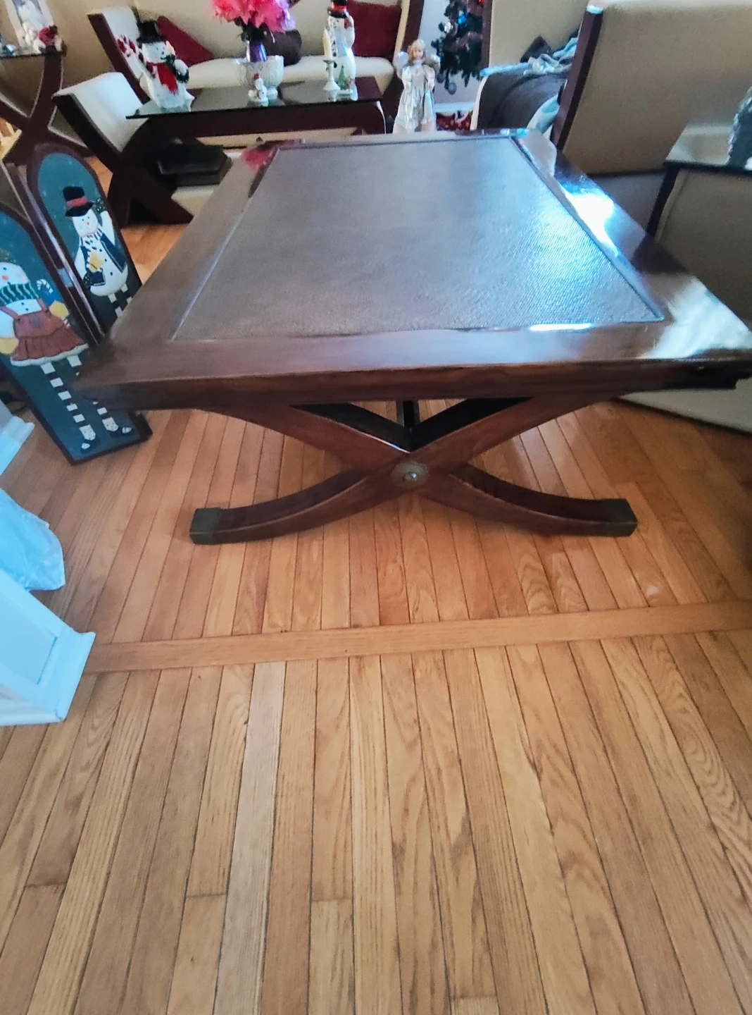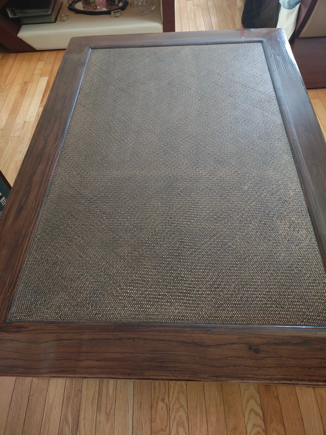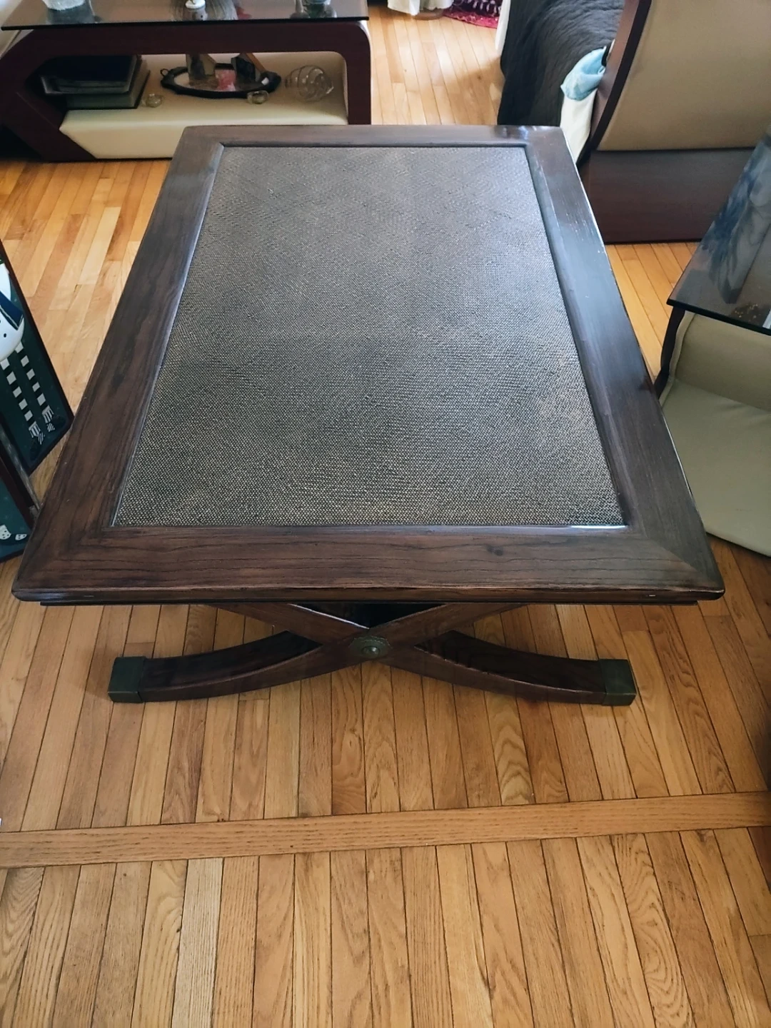 Selling a wooden coffee table with a woven top. It has a unique cross-legged base and a dark wood finish. This table would be a great addition to any living room!