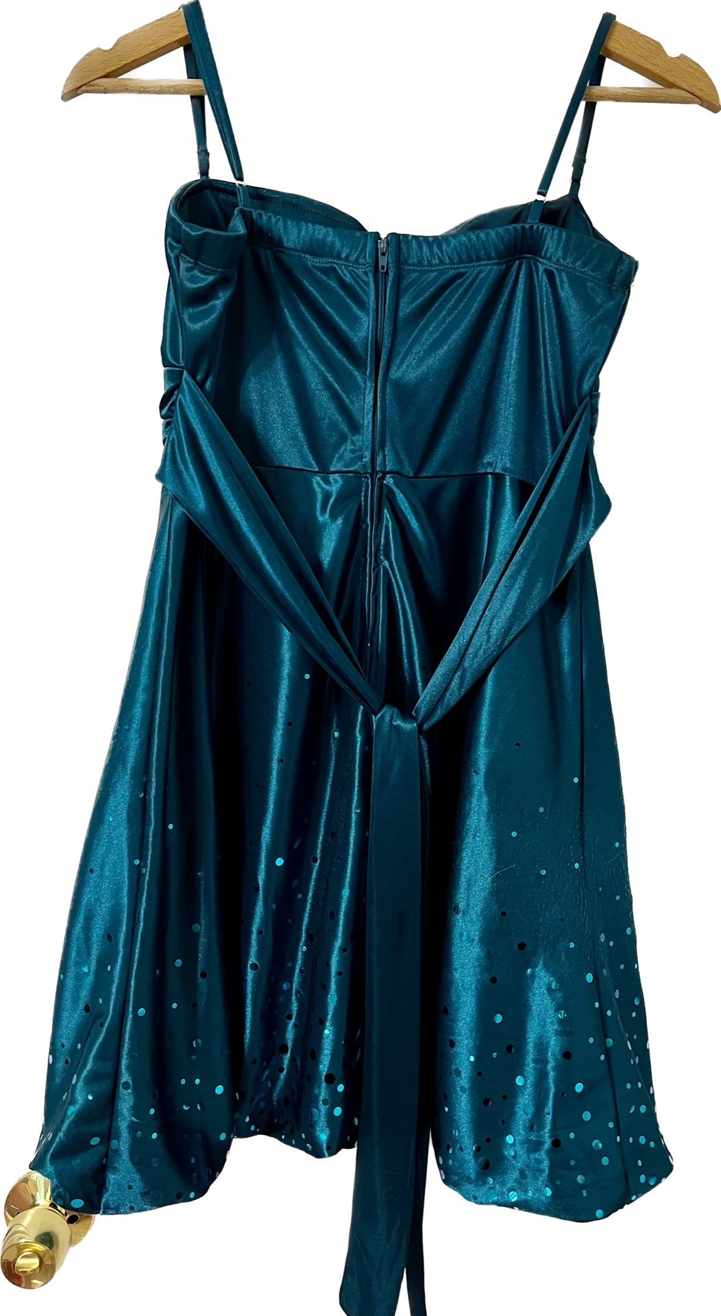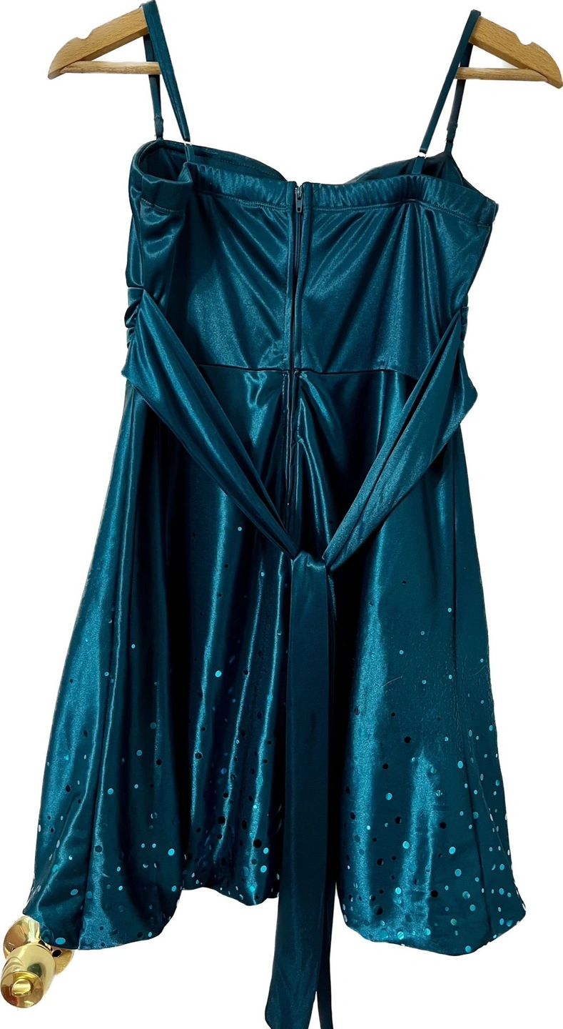 Tea length teal dress with spaghetti straps and cascading sequins on the bottom.