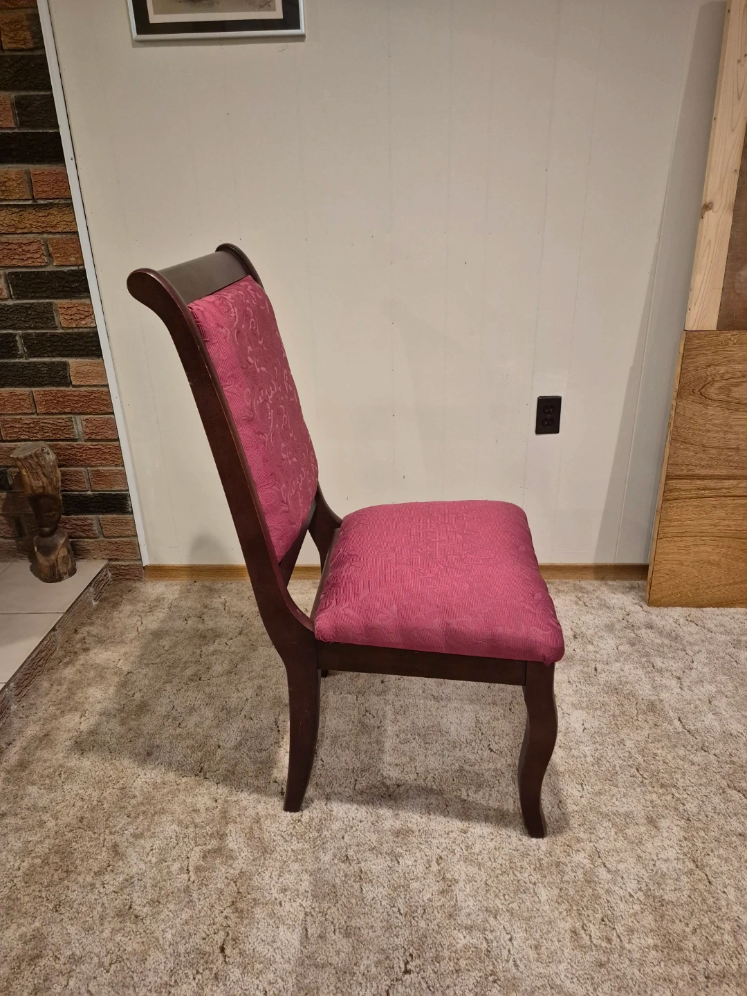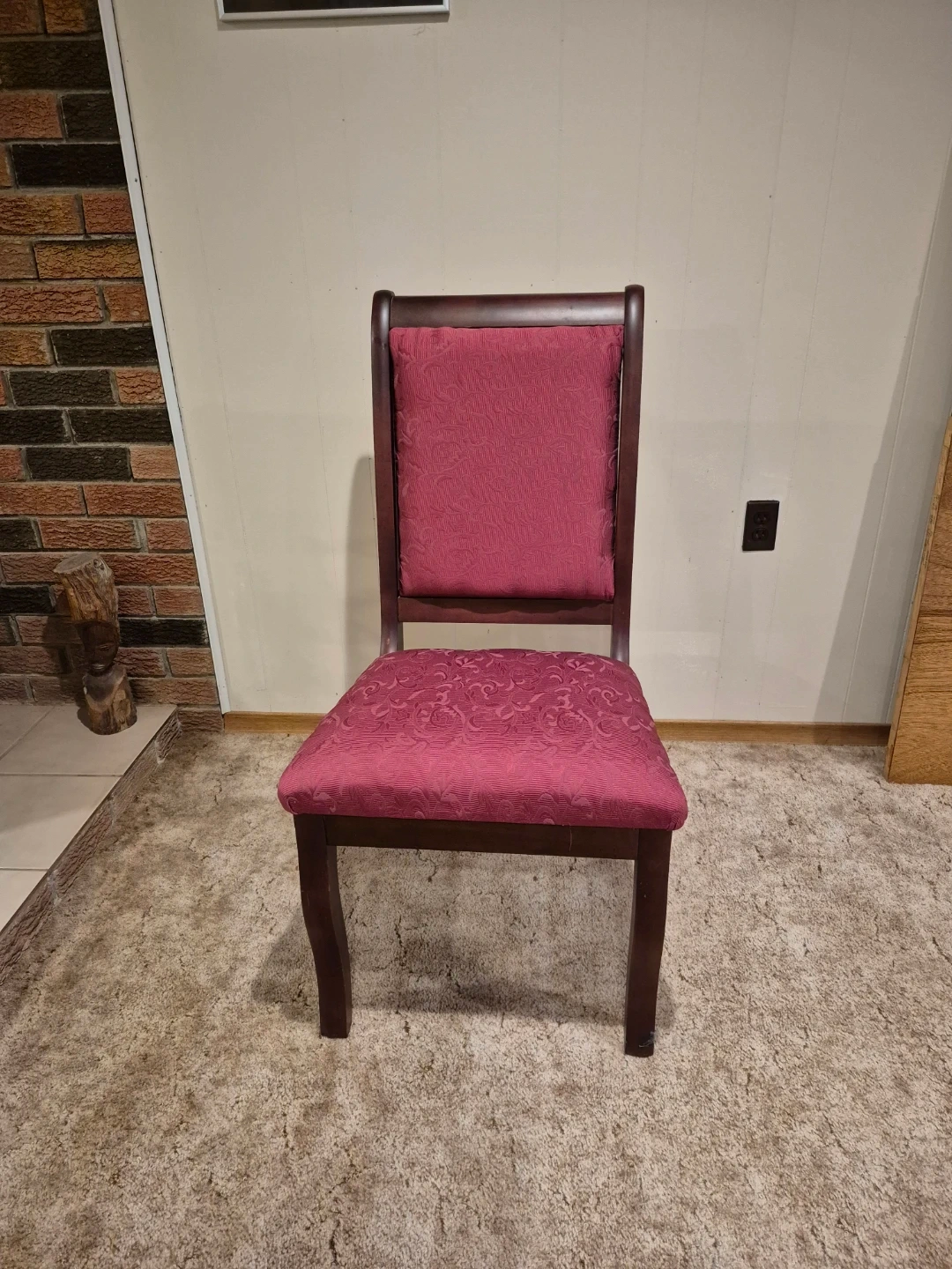 Selling a lovely burgundy upholstered dining chair. It's in great shape and would look great in any dining room or kitchen. The chair has a dark wood frame and a comfortable upholstered seat and back