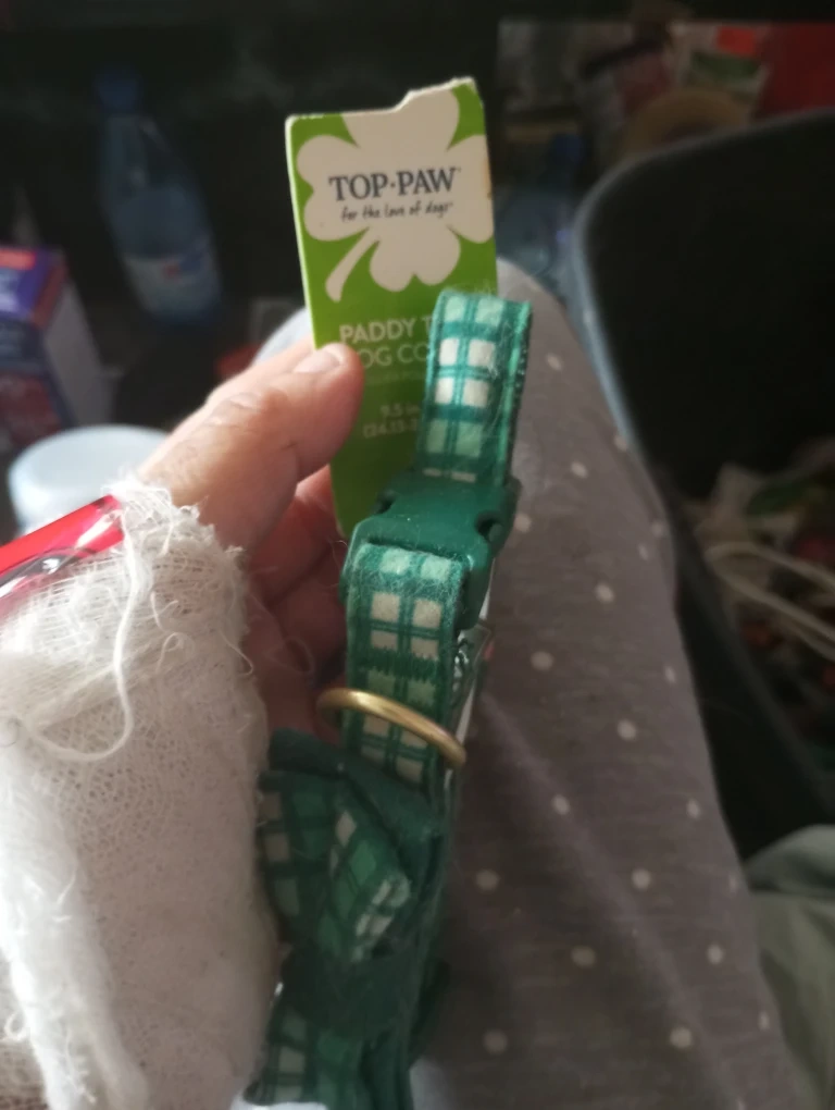 Selling a TOP-PAW Paddy Time dog collar. It's green and white plaid and fits neck sizes 9.5 to 14 inches (24.13-35.56 cm)