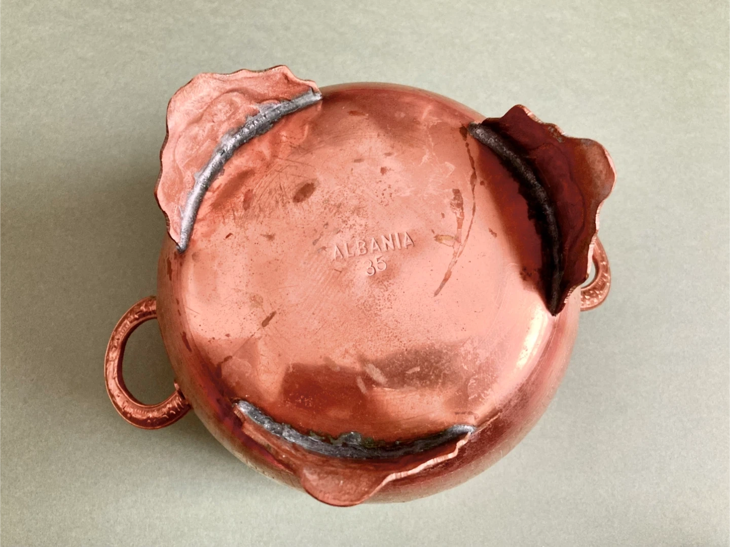Vintage copper pot with intricate etched design, detailed design on the handles and three feet. Marked 'Albania 35' on the bottom. Natural signs of wear and some minor oxidation. A beautiful and unique piece. 5 1/2 inches tall including the feet and a 6 inch diameter. This would be great as a planter or even a base for a small Christmas tree. Pick up in the Ossington and Davenport area. Check out my other listings for unique vintage home decor finds.🙂