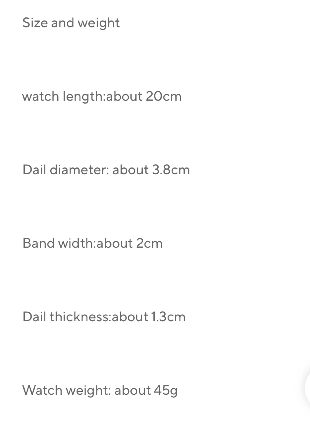 The band is made of silicone and has a buckle clasp. Watch length is about 20cm, dial diameter is about 3.8cm, band width is about 2cm, and dial thickness is about 1.3cm. The watch weighs about 45g