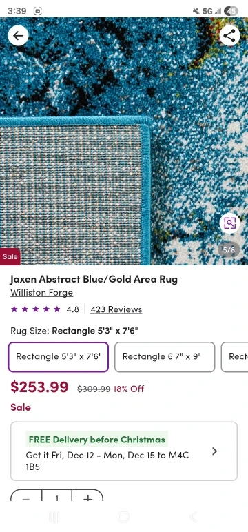 Selling a Williston Forge Jaxon Abstract area rug in blue and gold. It's a rectangle shape and measures 5'3" x 7'6". Originally bought for $280