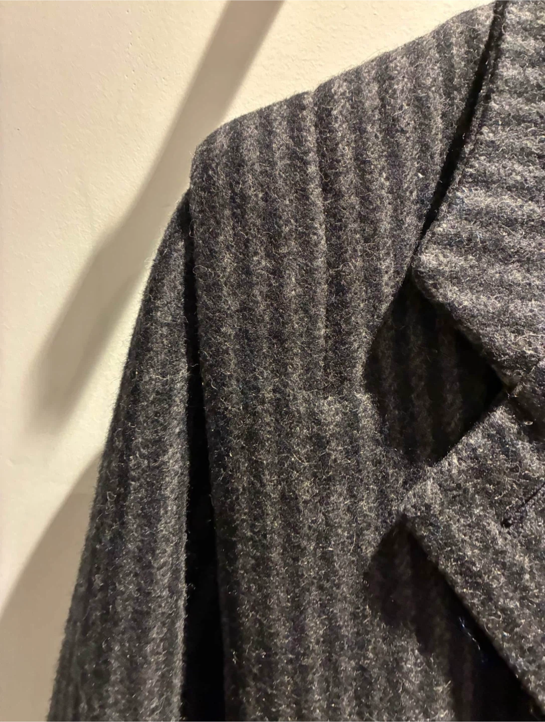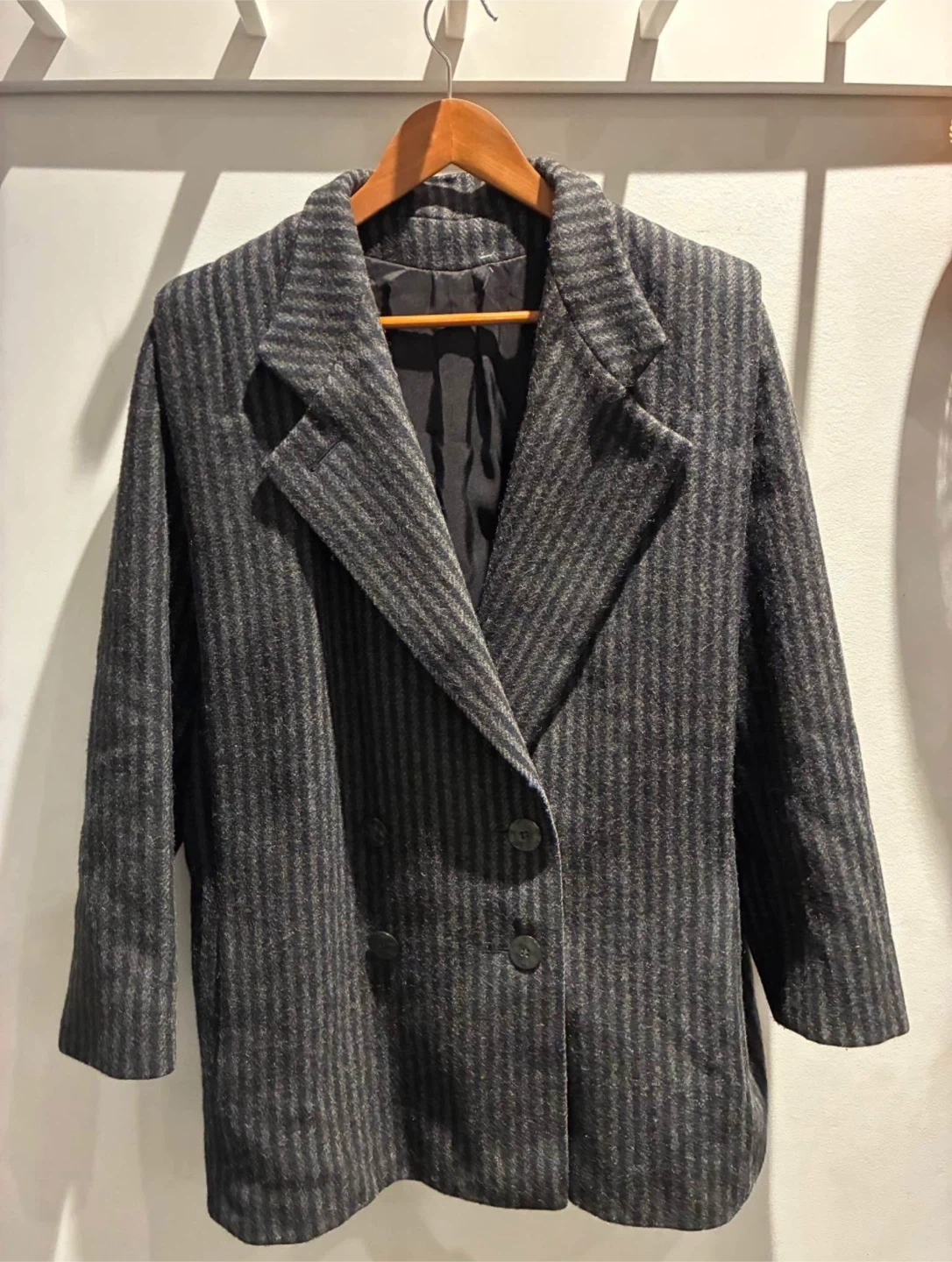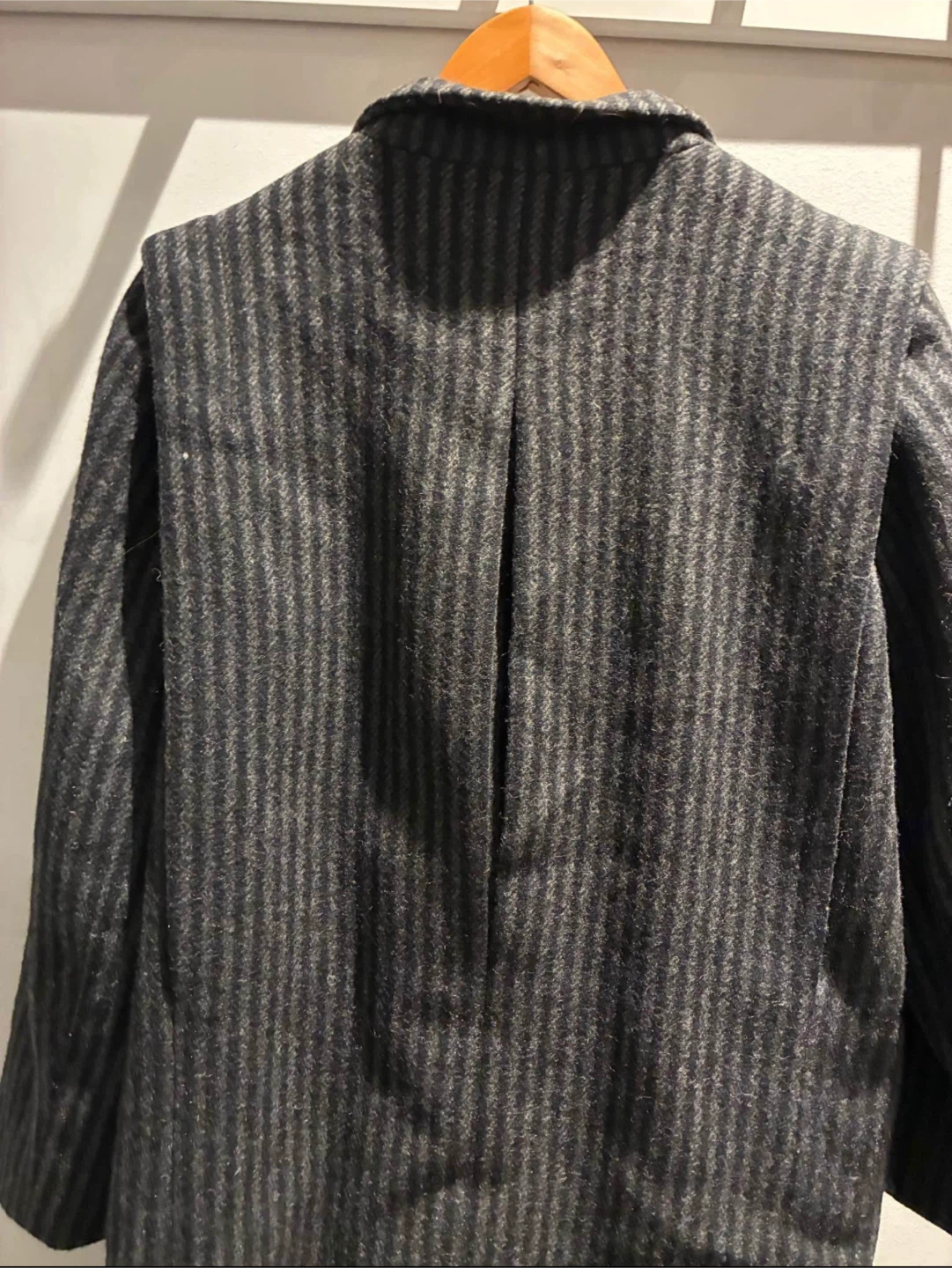 Selling a vintage blazer coat in a striped wool blend. It's in great condition and ready for a new owner! The colour is a stylish mix of grey and black, perfect for dressing up or down. It's a classic piece that will add a touch of sophistication to any outfit