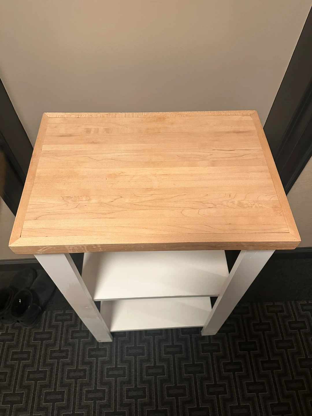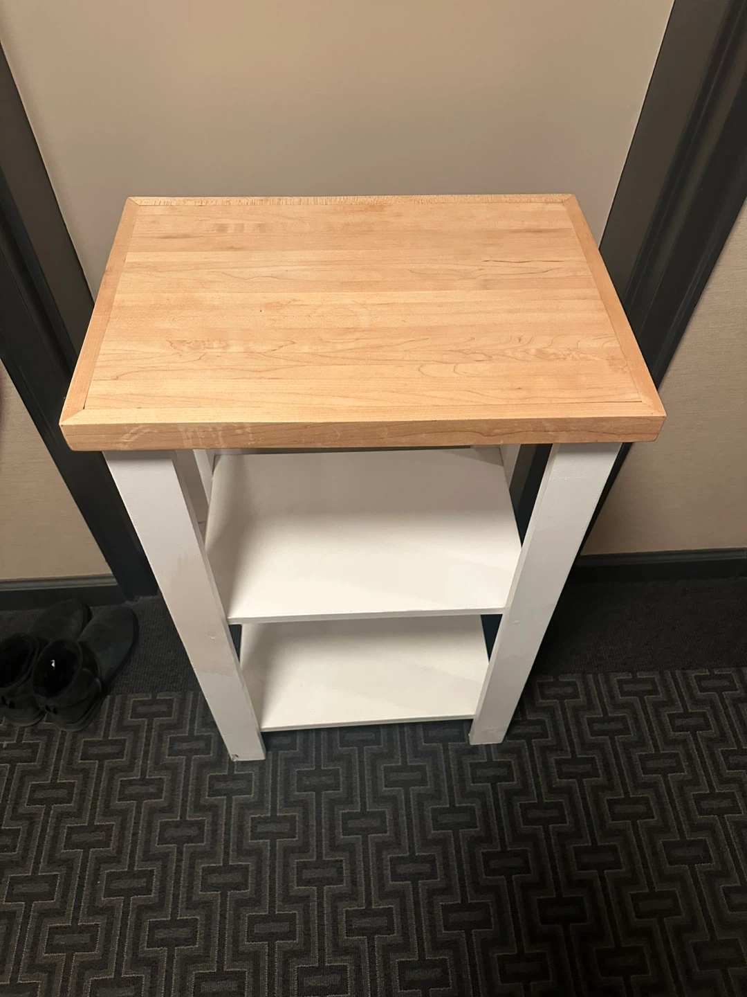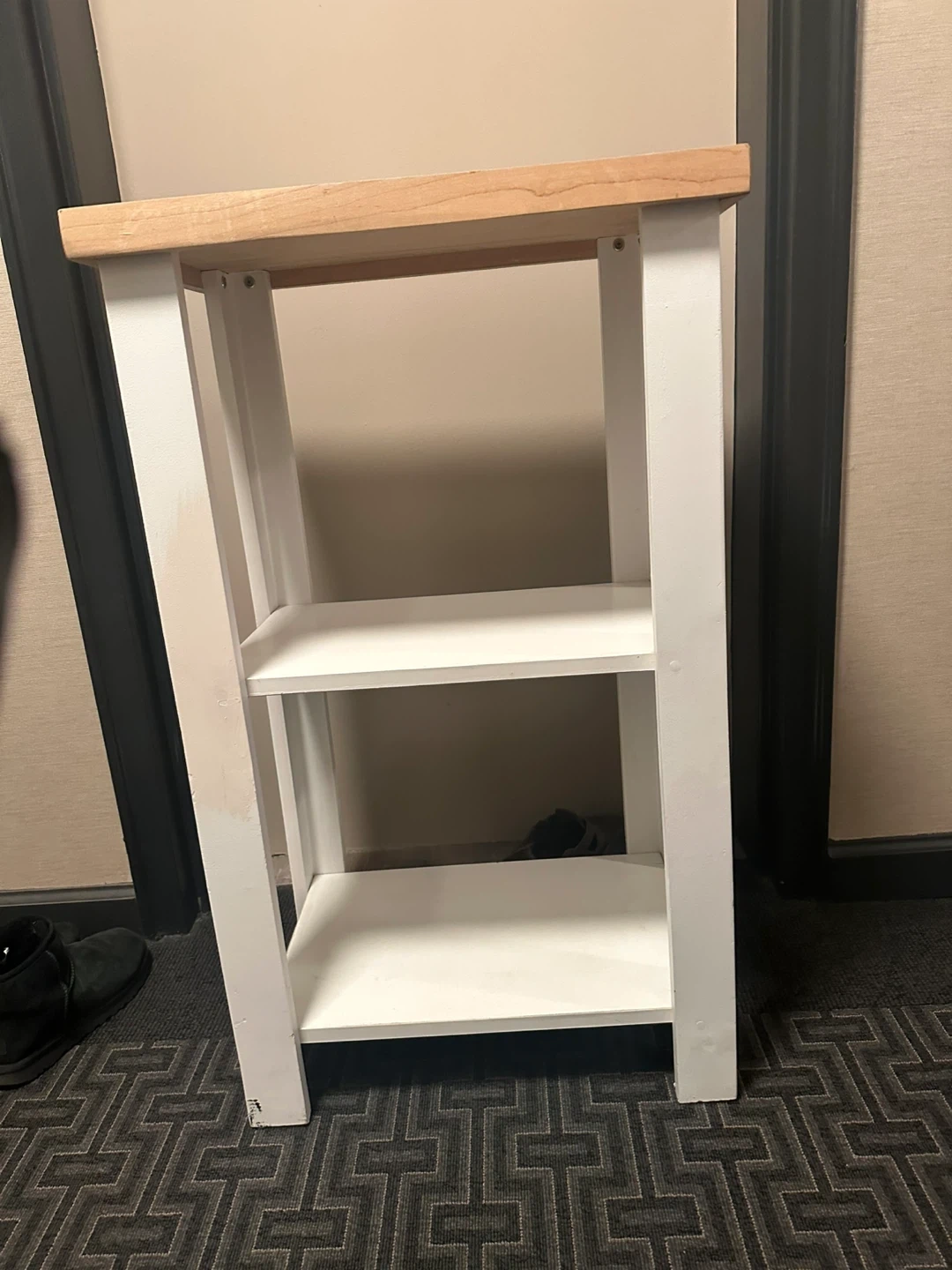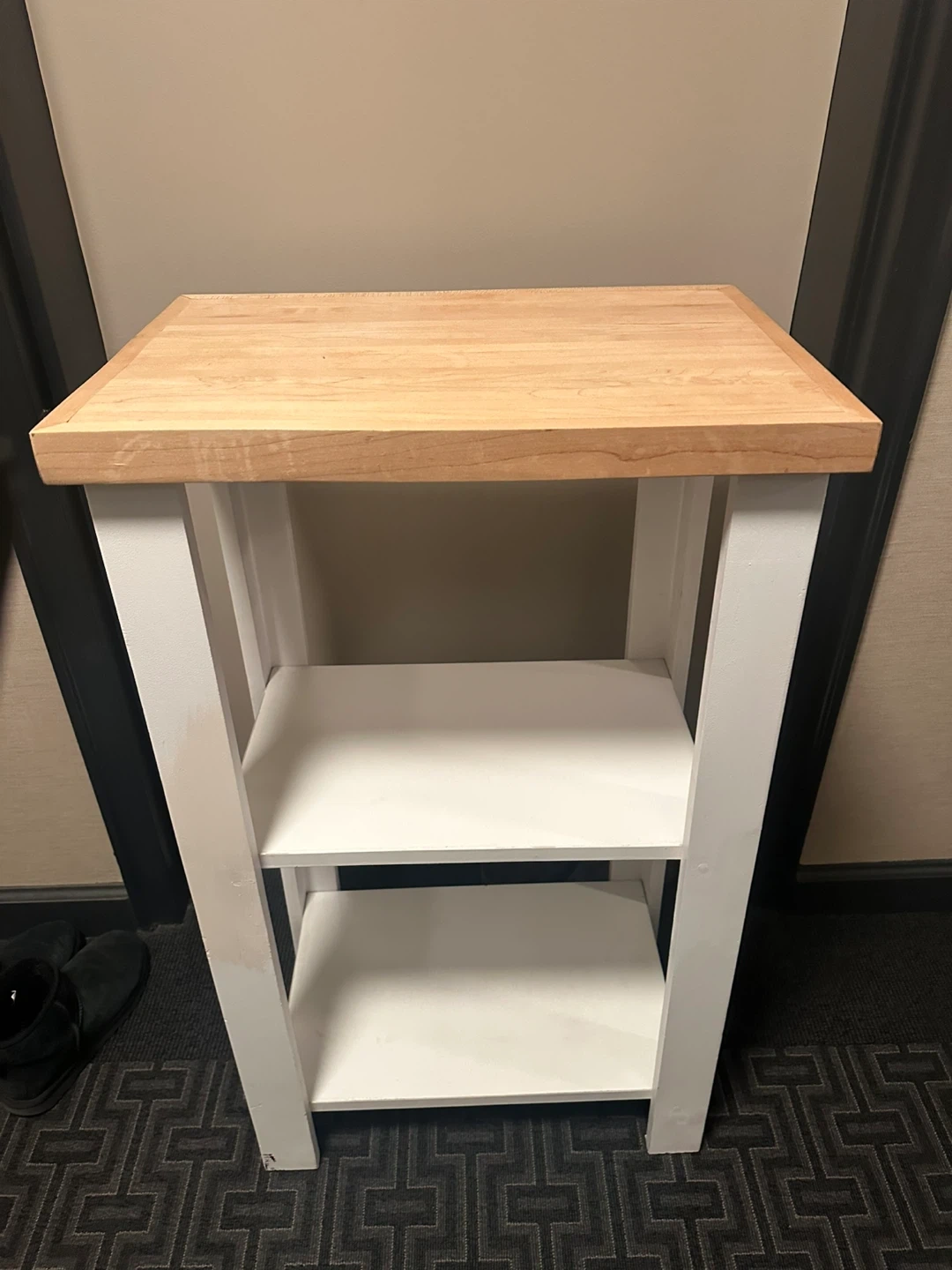 Selling a small table with a wooden top and white frame. It has three shelves, perfect for storage or display. It is in good condition and ready for a new home!