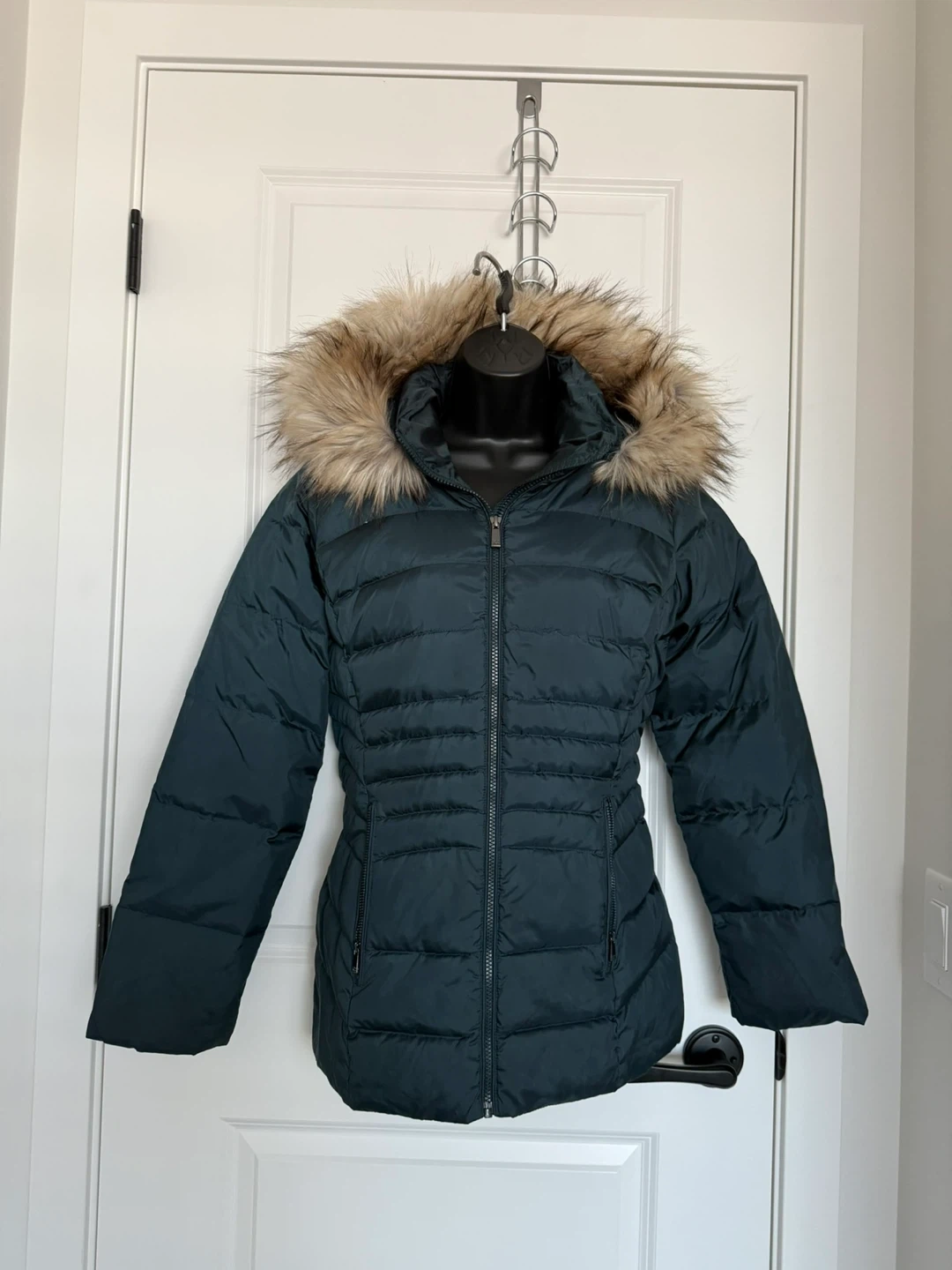 A cozy winter puffer jacket in a lovely dark green colour! It features a faux fur hood to keep you extra warm. Perfect for chilly days! Can fit to M as well