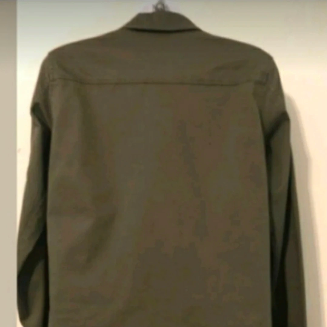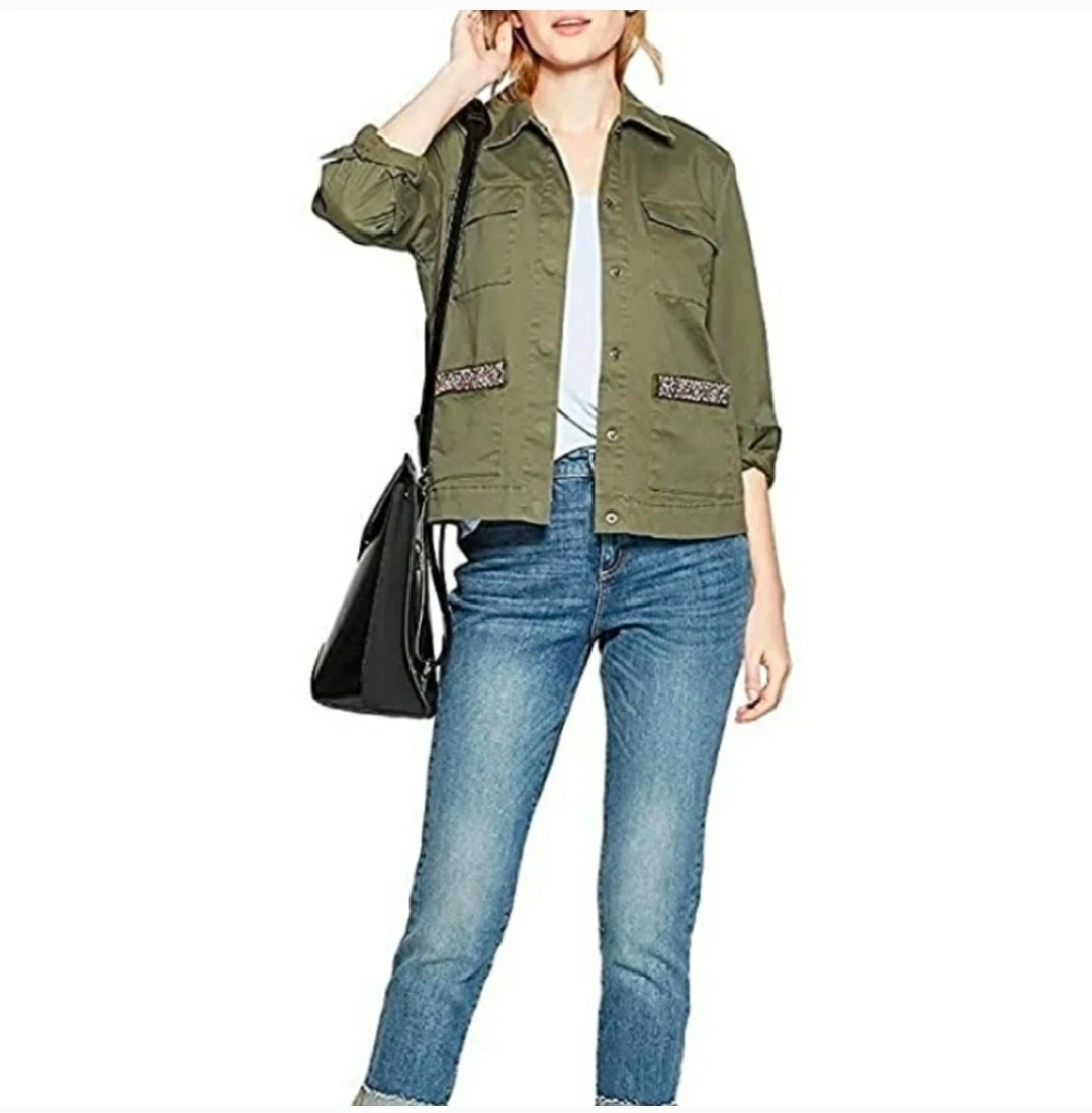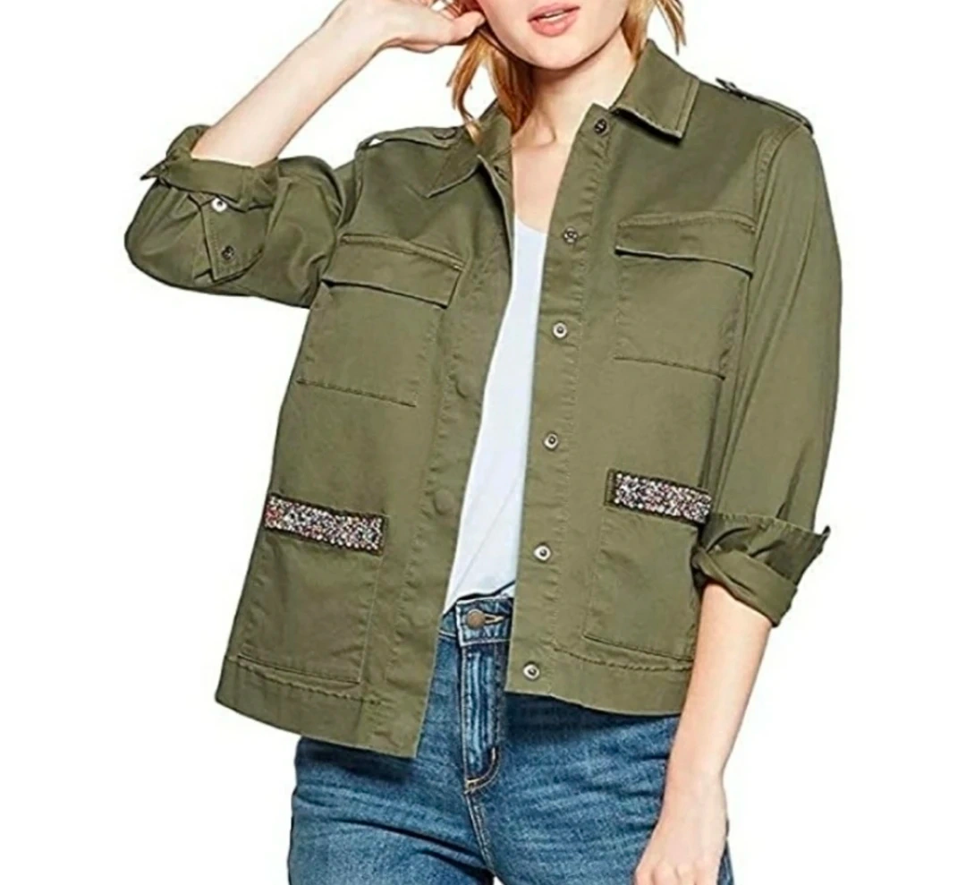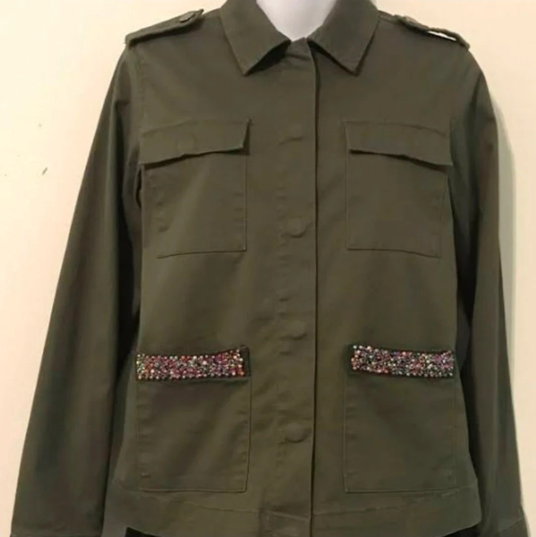 This is a cute Universal Thread brand jacket in an olive green color. It features four pockets and a decorative trim on the lower pockets. Perfect for layering!