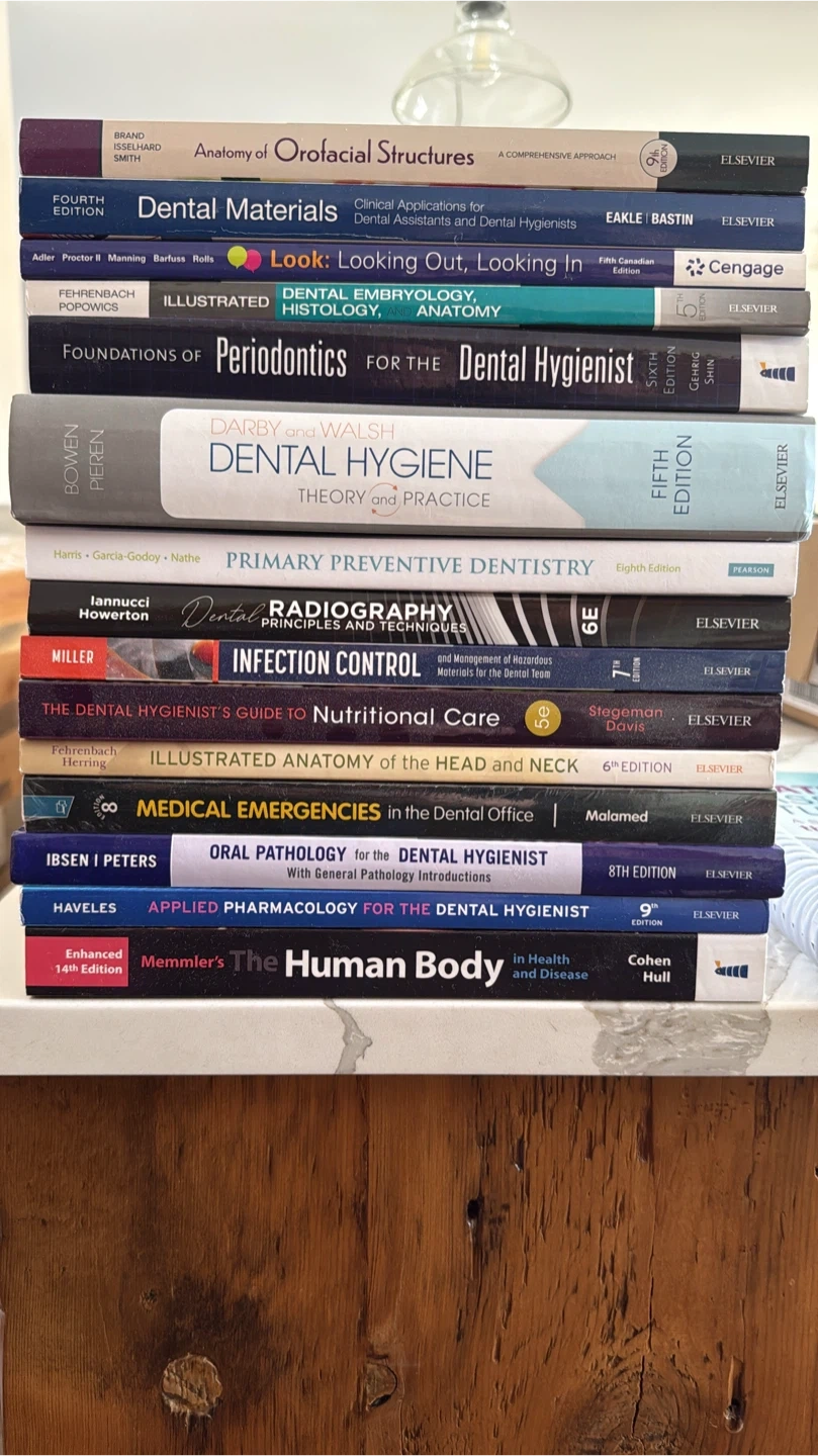 Selling a bundle of textbooks related to dental hygiene. ( course completed June 2025) Includes titles such as Patient Assessment Tutorials, Fundamentals of Periodontal Instrumentation, Anatomy of Orofacial Structures, Dental Materials, and more. These books are great for students or professionals in the field. Willing to sell separately.