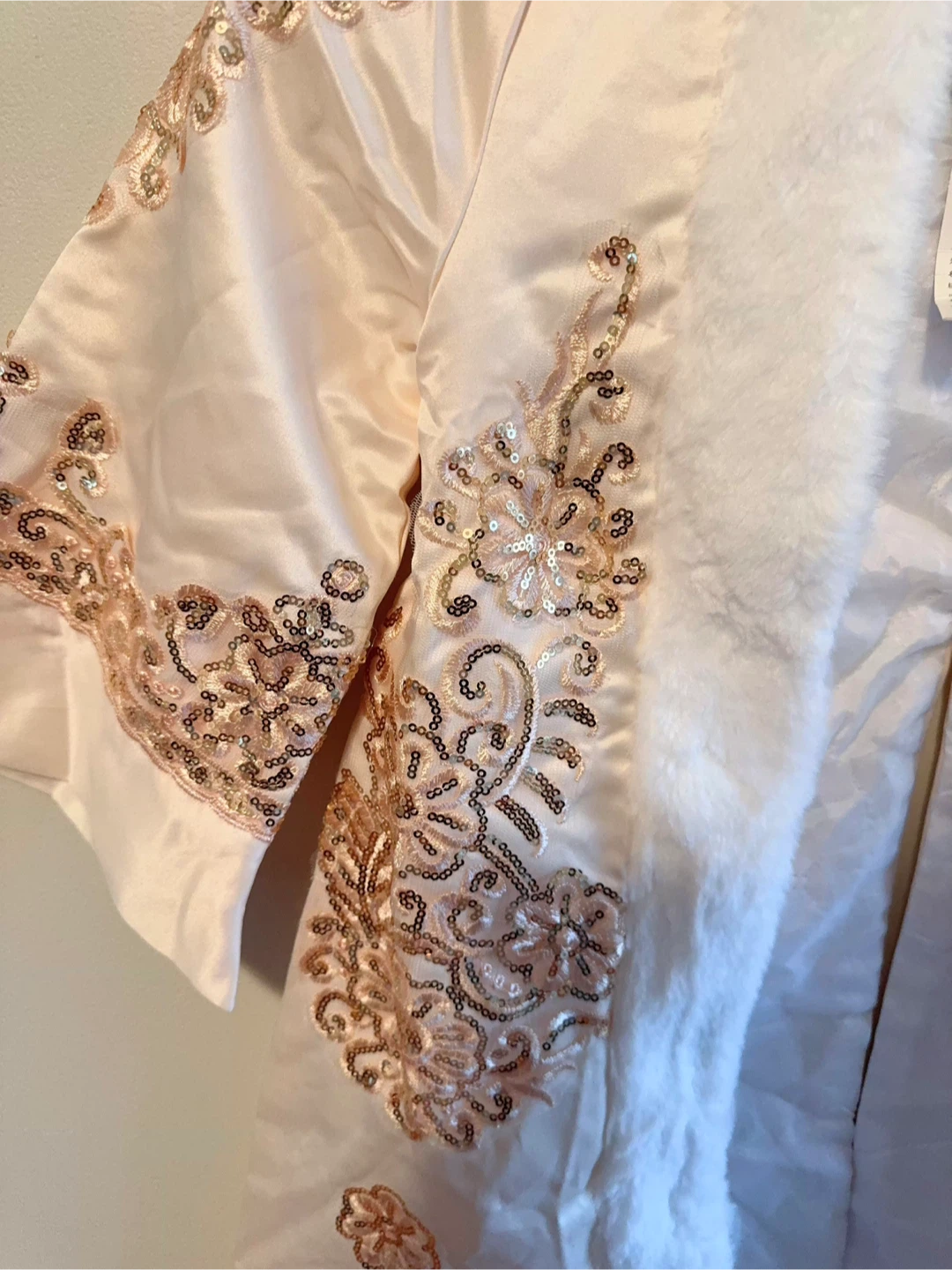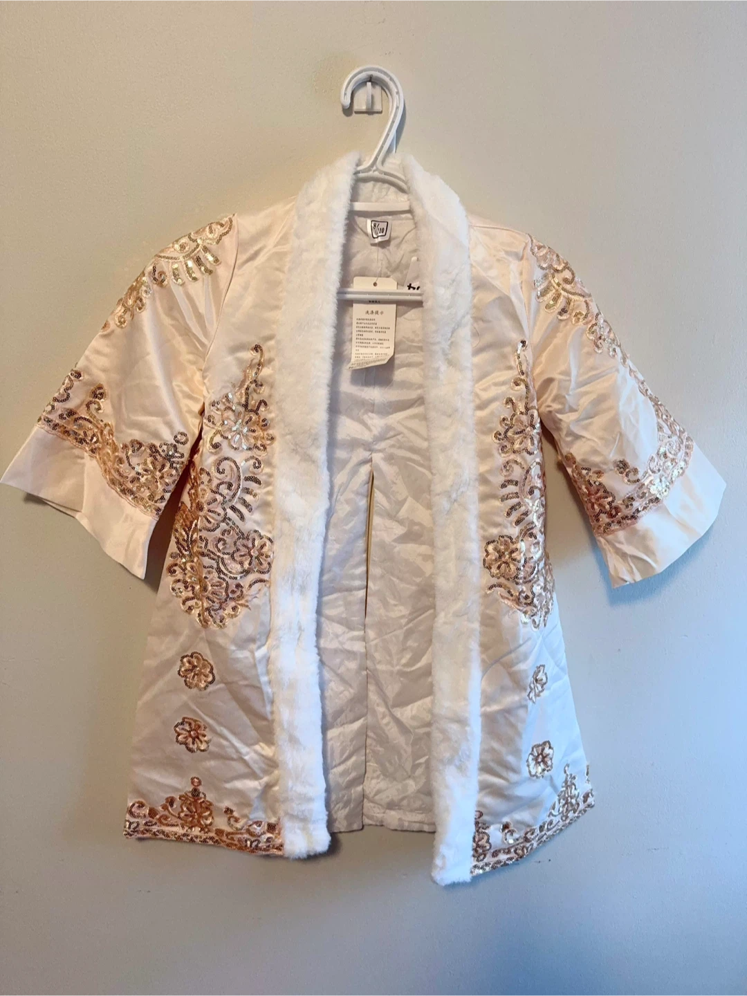 This is a beautiful girls' poncho, perfect for special occasions! It features lovely embellishments and a soft, fur-like trim. It's in great condition and ready for a new owner!