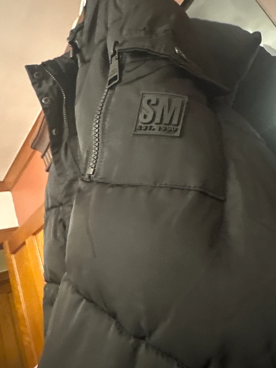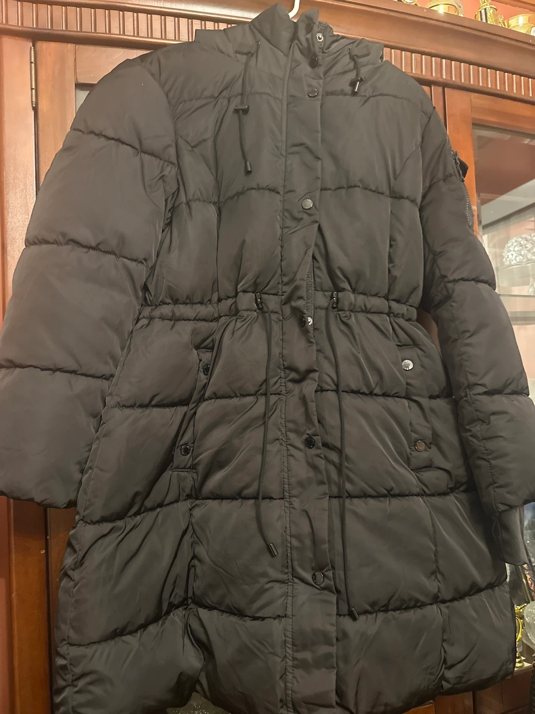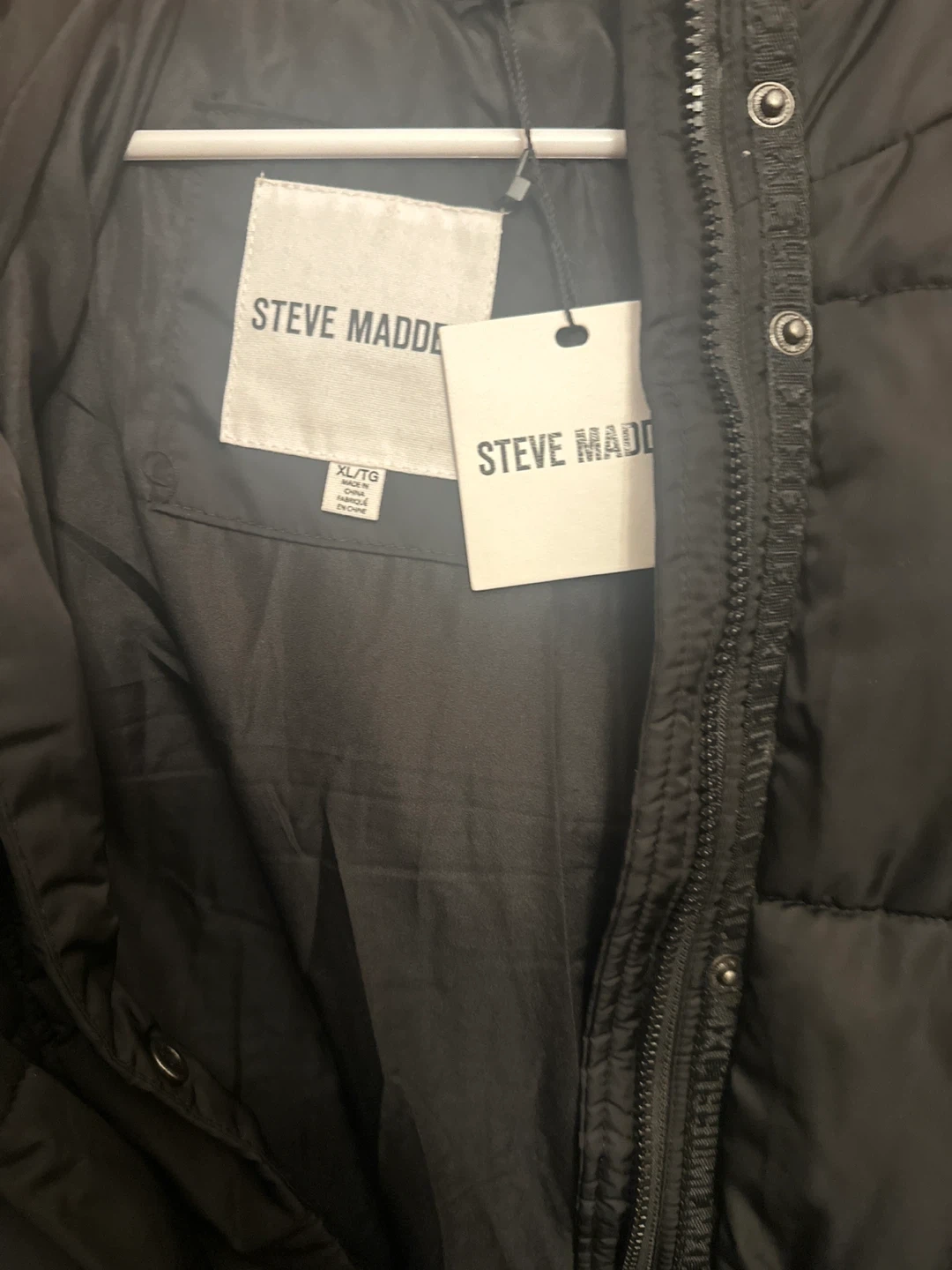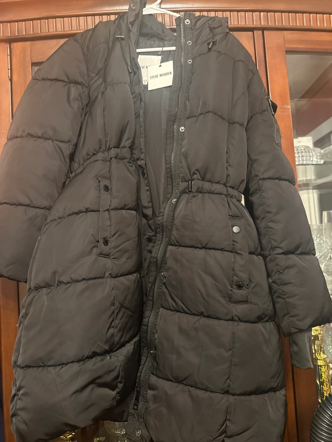 Selling a Steve Madden black puffer coat in size XL. It's in great condition and perfect for staying warm this winter! The coat features a stylish design with a cinched waist and a cozy hood.