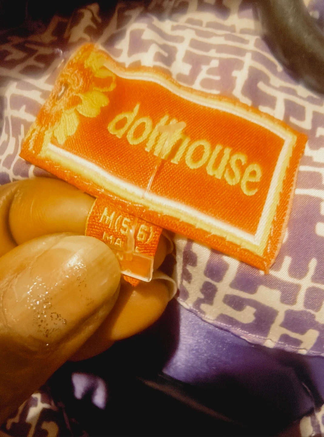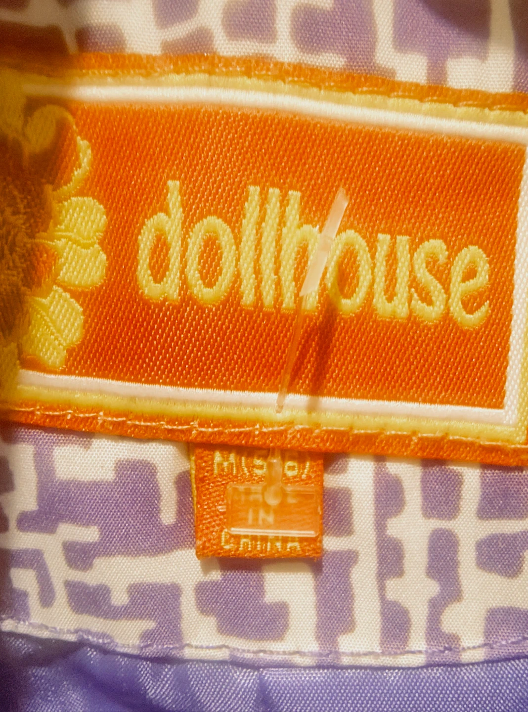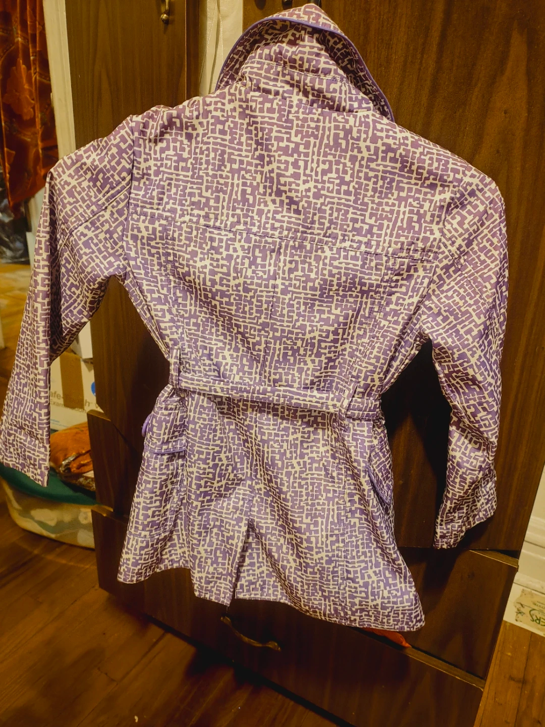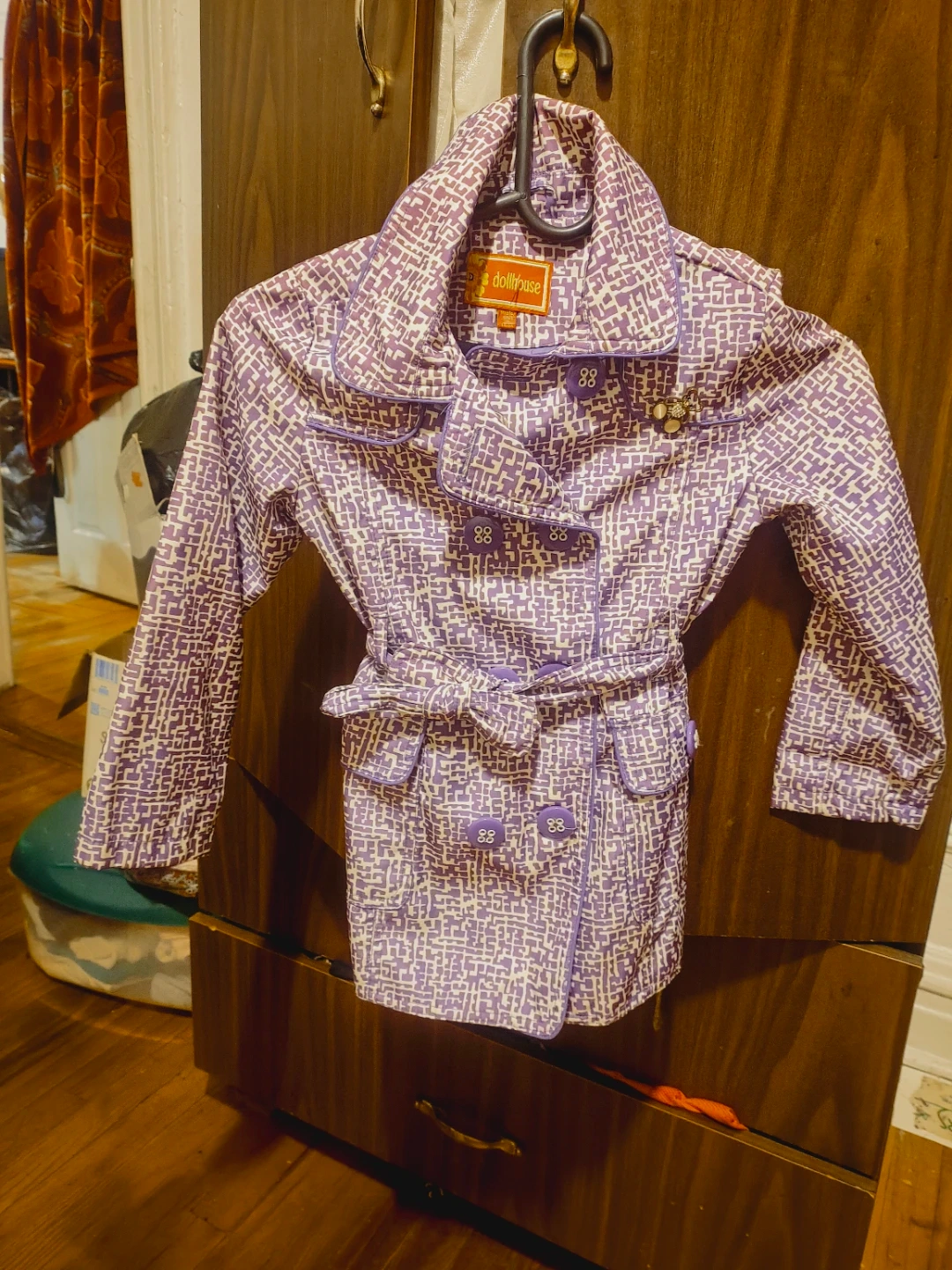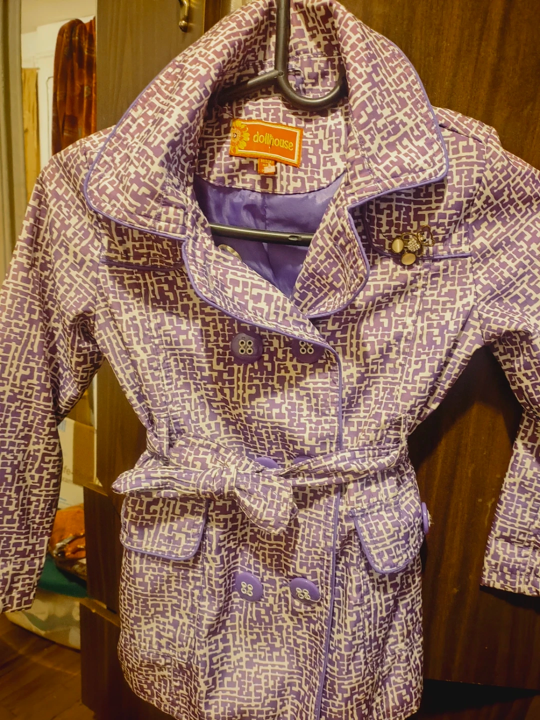 Let's get into this purple trench coat by DOLLHOUSE. This is a cute girls coat from Dollhouse! It features a unique purple and white patterned design with a belted waist & real pockets The size is M (5-6). It's in great condition and ready for a new owner! Used us great condition.