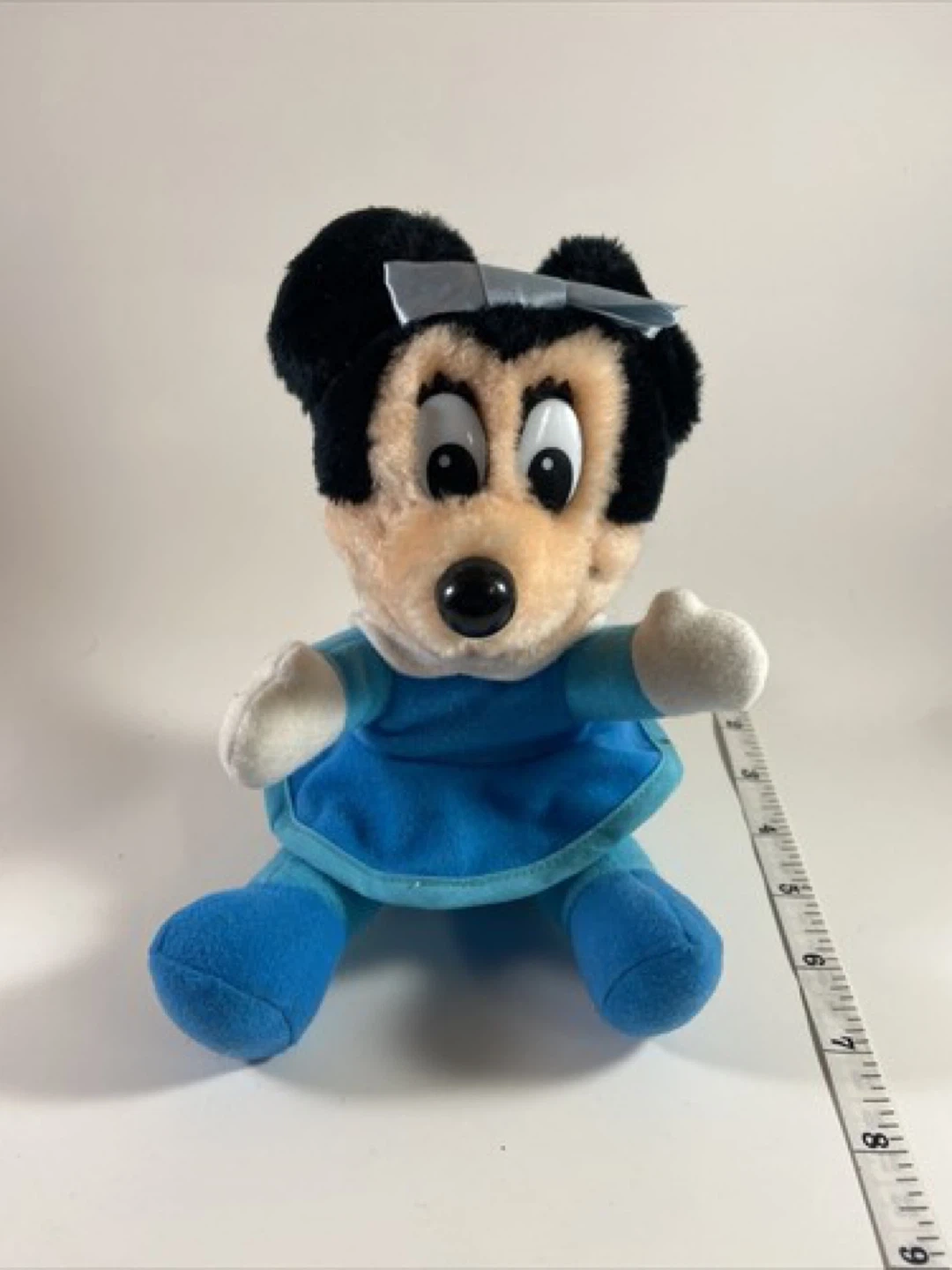 Here's a cute Minnie Mouse plush toy! She's wearing a blue dress and has a matching blue bow. Perfect for any Disney fan or as a cuddly friend for a child