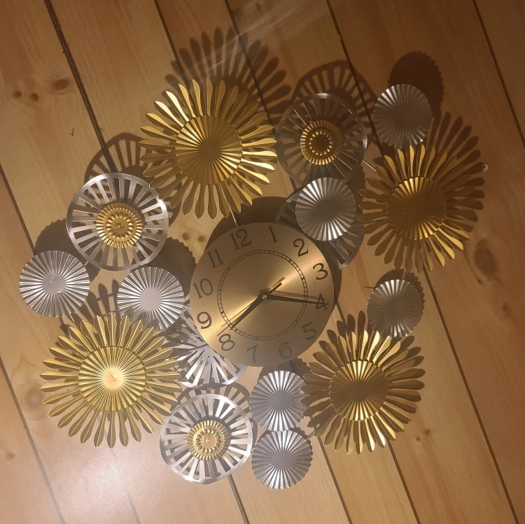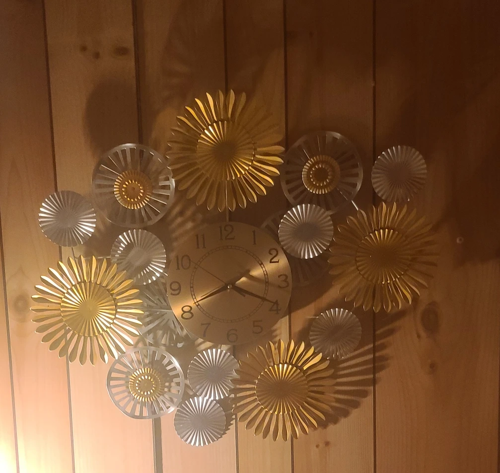 Selling a decorative wall clock with a unique floral design. It features a combination of gold and silver accents, making it a stylish addition to any room. The clock is in great condition and ready to brighten up your space!