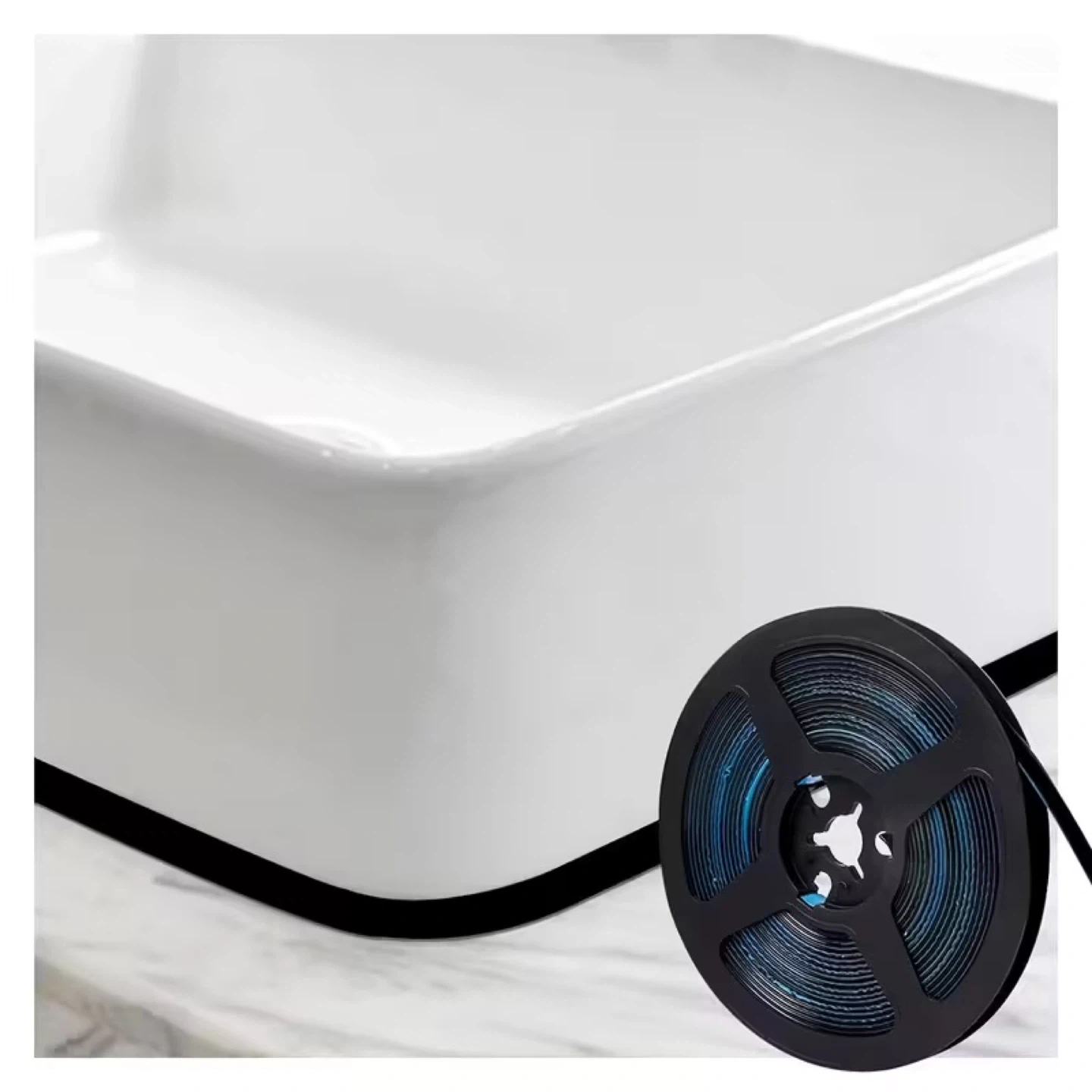 This black self-adhesive PVC sealing waterproof tape edge strip is perfect for use in kitchens, bathrooms, windows, and more to create a watertight seal. The 6m length allows for easy application to edges and corners, while the adhesive backing ensures a secure grip. Made from durable PVC material, this tape is designed to withstand moisture and prevent leaks, making it a practical and convenient solution for kitchen and bathroom sealing.