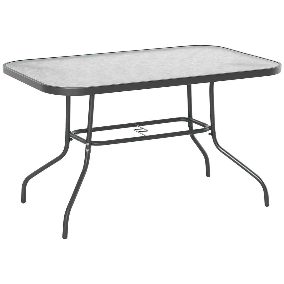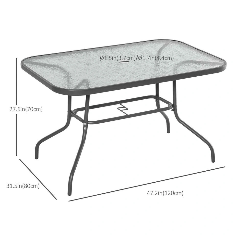This outdoor dining table features a built-in umbrella hole suitable for most sunshades. The tempered glass top and metal frame provide durability and modern style. Its dimensions are 47.25" L x 31.5" W x 27.5" H, with a maximum load capacity of 154 lbs. The table is easy to assemble and maintain, requiring only a wet cloth for cleaning. Ideal for gardens, patios, or balconies, it serves as a perfect spot for coffee or gatherings. The safe round corner design adds an extra layer of safety for families.