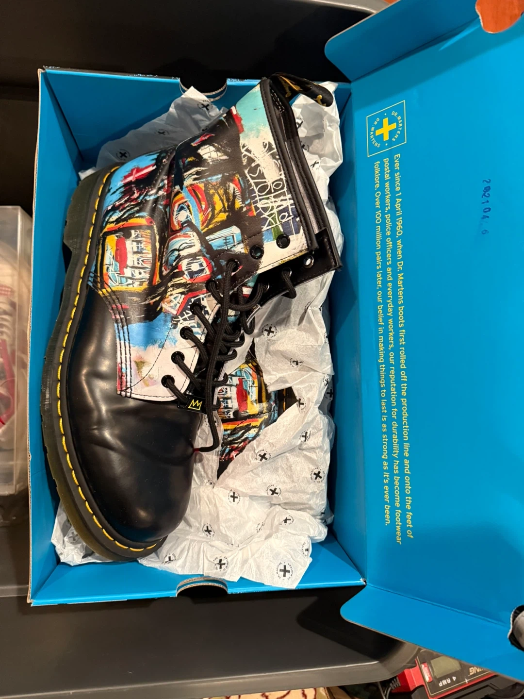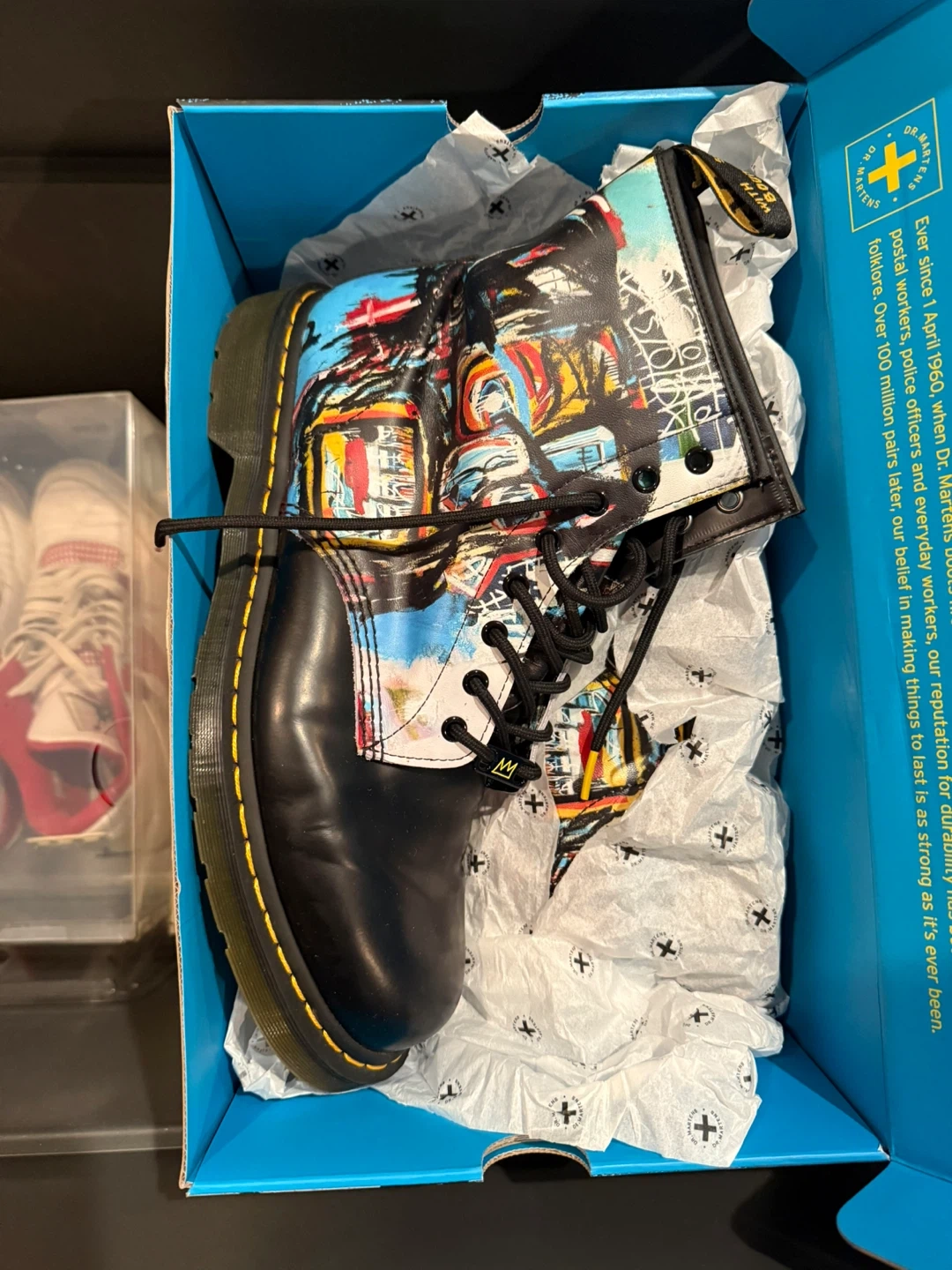Selling a pair of Dr. Martens 1460 boots in collaboration with Basquiat! These leather boots feature a unique design and come with the original box.