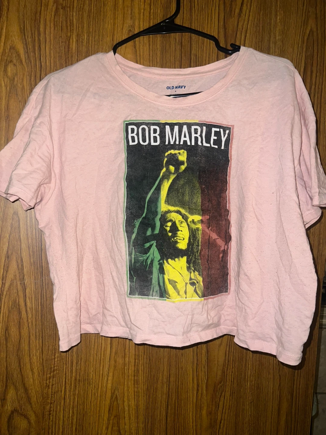 Preloved SIZE M Old Navy pink Bob Marley graffic crop top that can probably fit up to a L/XL and has small marks/stains from being worn as pajamas