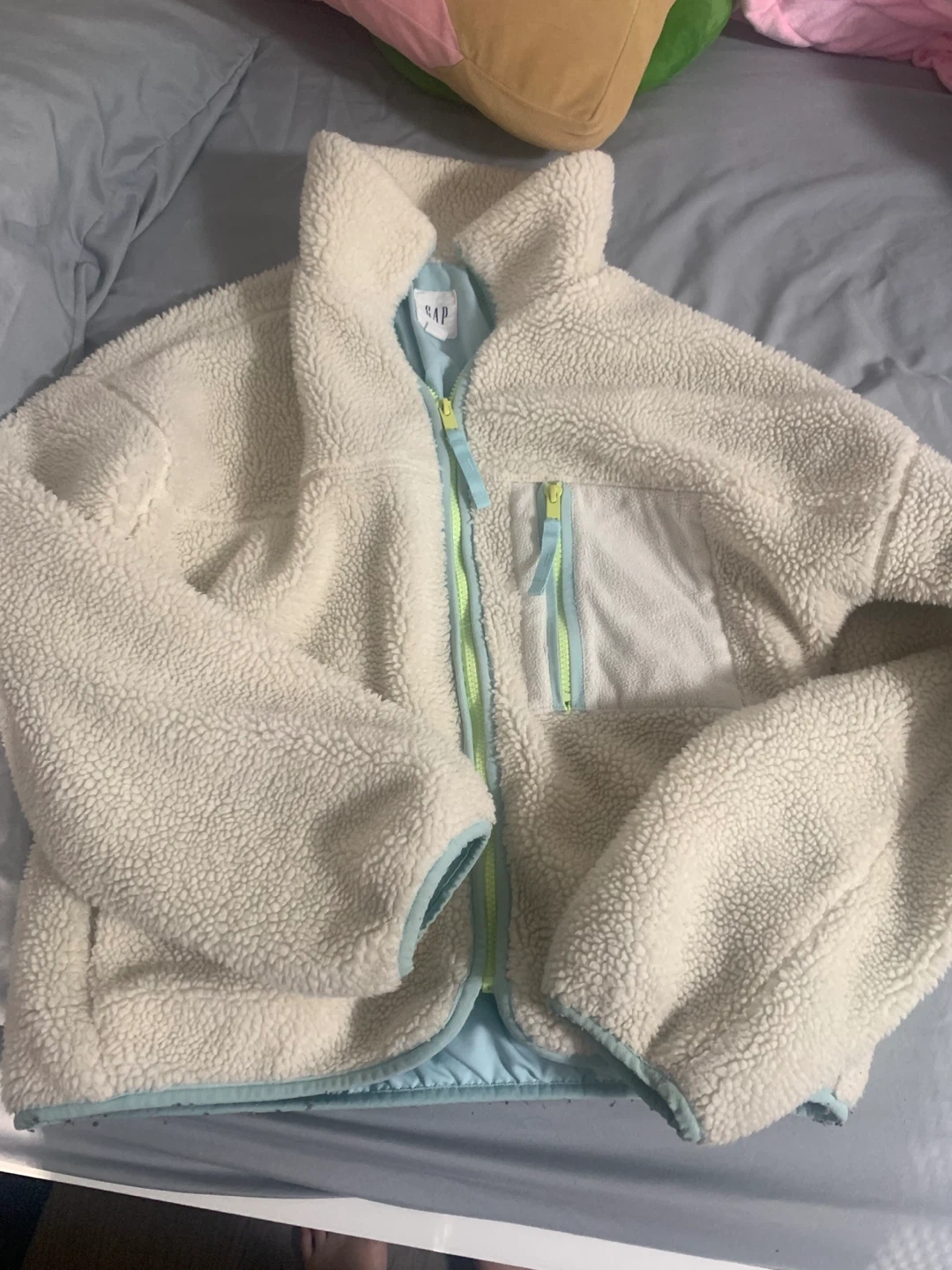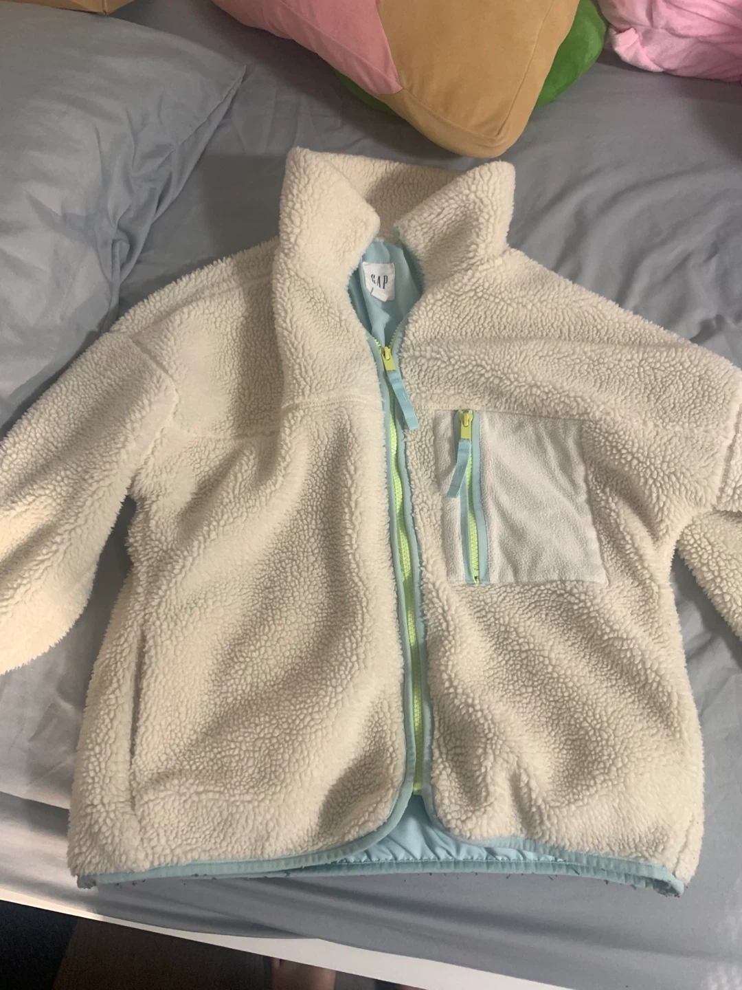 Selling a cozy Gap sherpa jacket in cream colour! It's super soft and perfect for layering during the cooler months. It features a high neck and a contrasting zipper detail. It's in great condition and comes from a smoke-free home