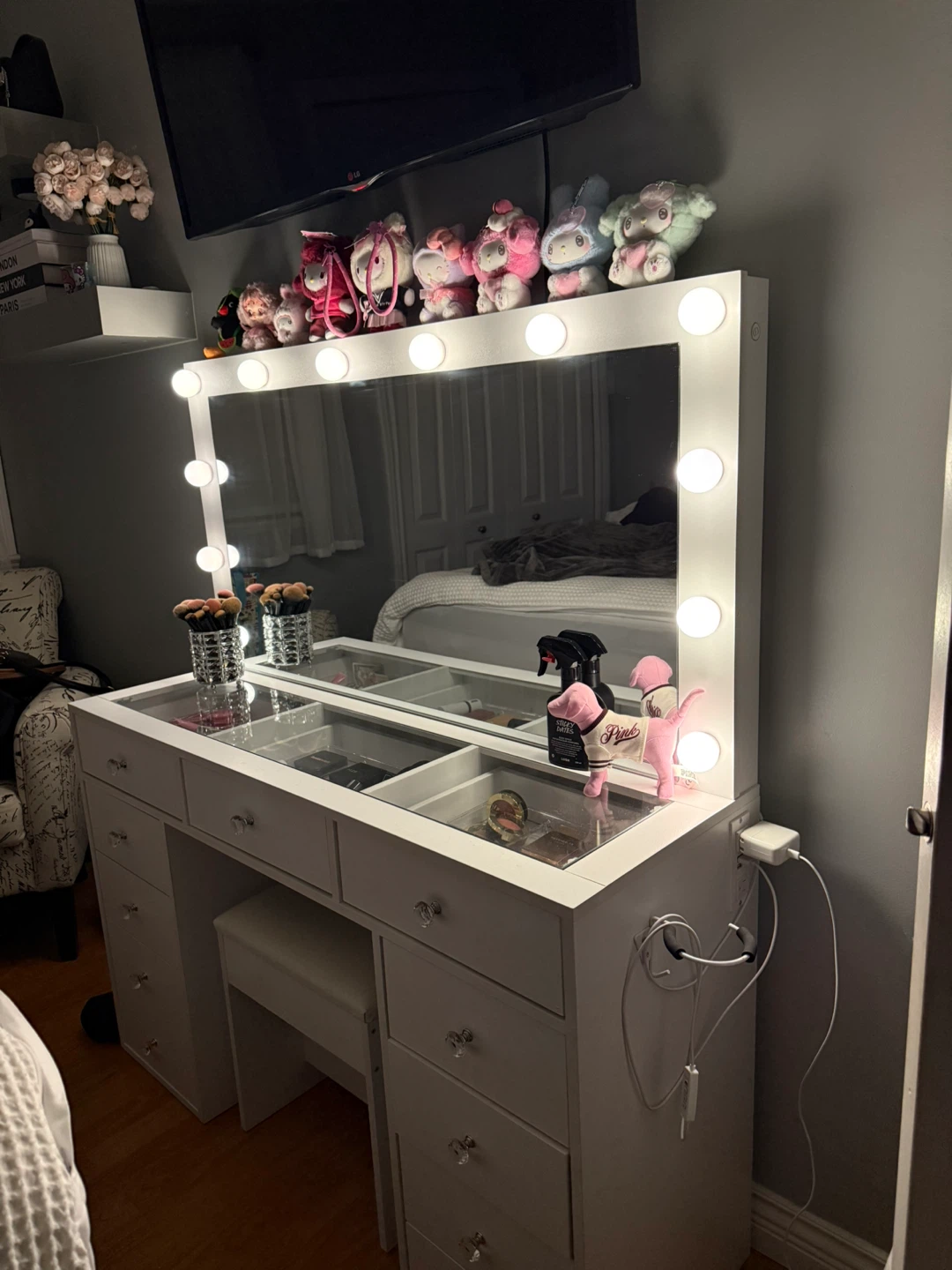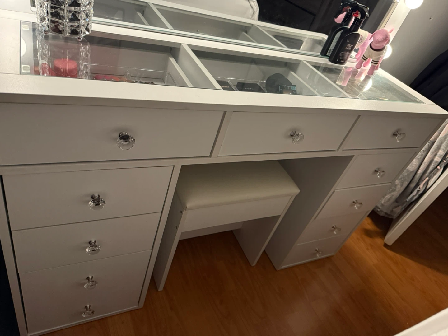 Selling a beautiful vanity makeup table with a lighted mirror. It's in great condition and perfect for getting ready! The drawers offer plenty of storage for all your cosmetics and accessories. Comes with a matching stool.
