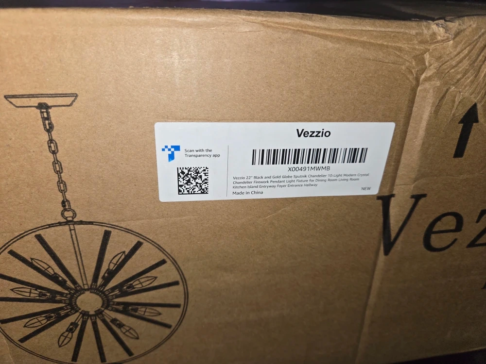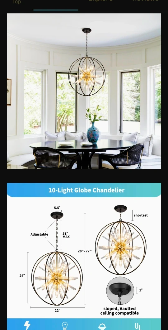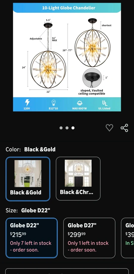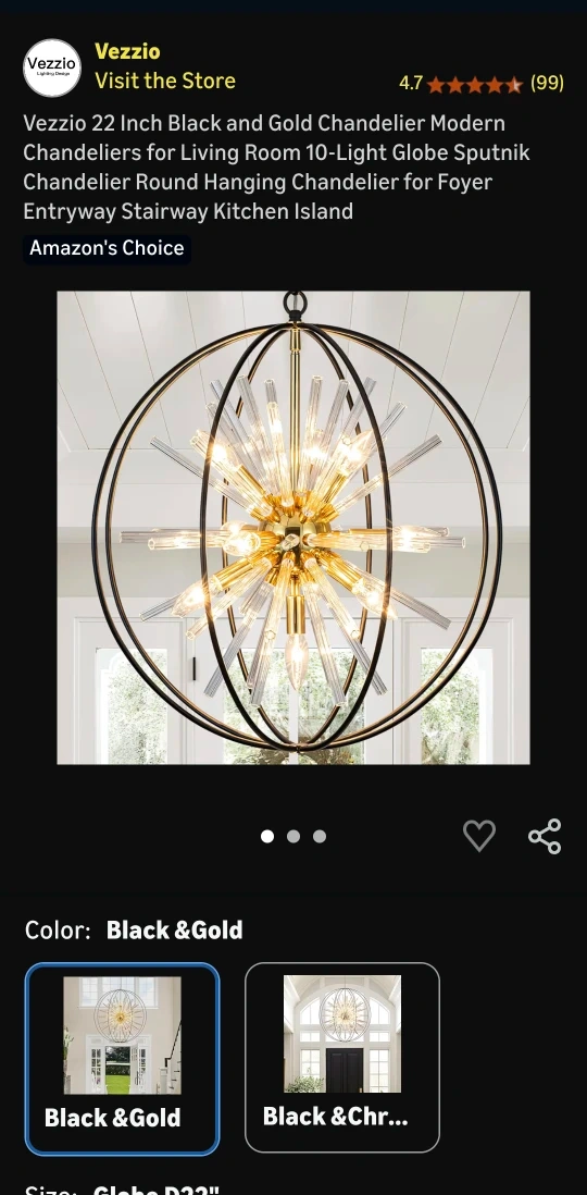 Selling a brand new Vezzio 22 inch chandelier in black and gold! It's still in the box. This modern chandelier is perfect for a living room, foyer, entryway, or kitchen island. It's a 10-light globe Sputnik chandelier with an adjustable chain (28"-77" max). It is vaulted ceiling compatible. This chandelier requires E12-10 bulbs and supports up to 600W.
