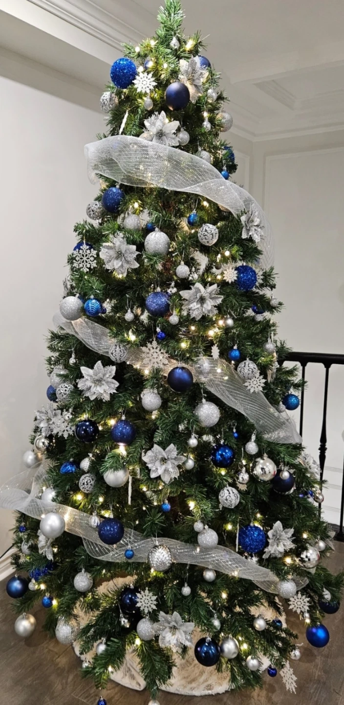 Selling a decorated 6ft pre-lit Christmas tree with blue and silver ornaments. It's perfect for adding a festive touch to your home during the holidays!