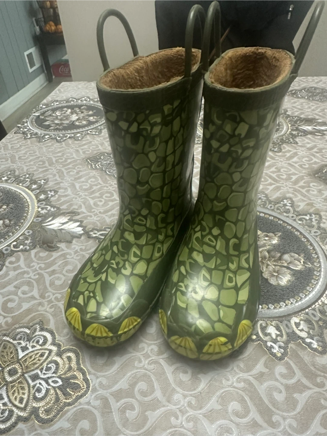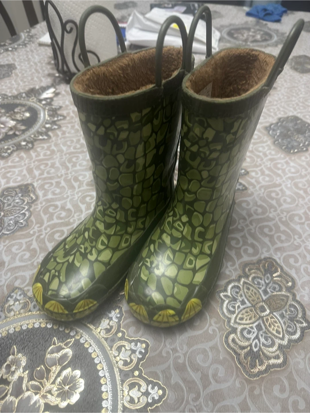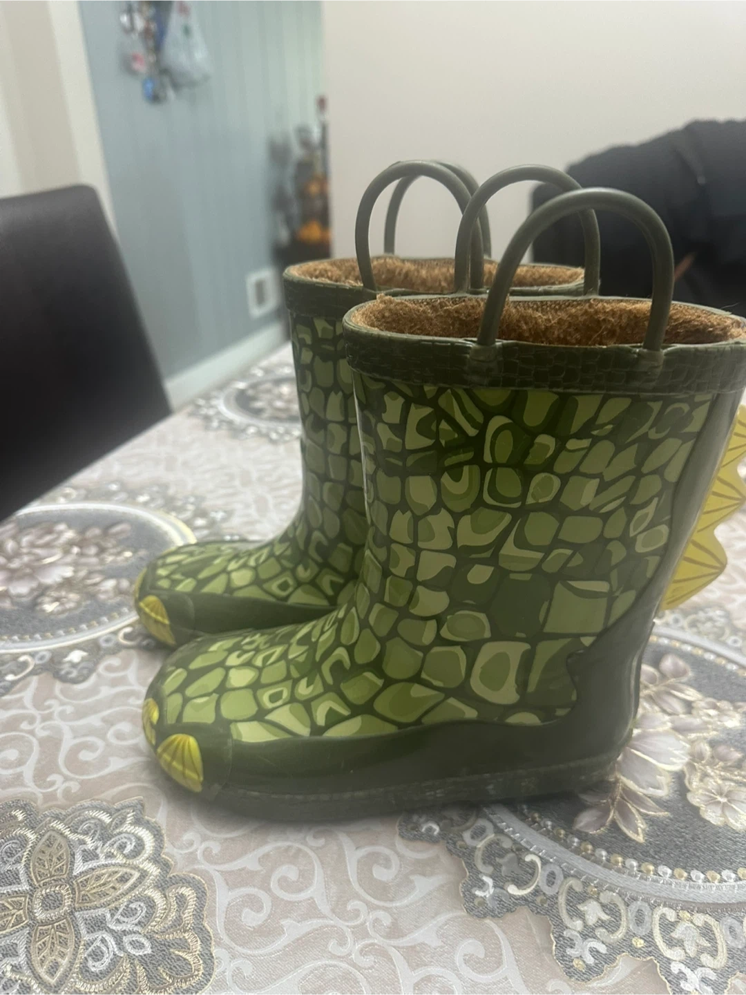 These kids' rain boots are in great condition and ready for some puddle jumping! They feature a fun green pattern and are perfect for keeping little feet dry on rainy days size 11/12