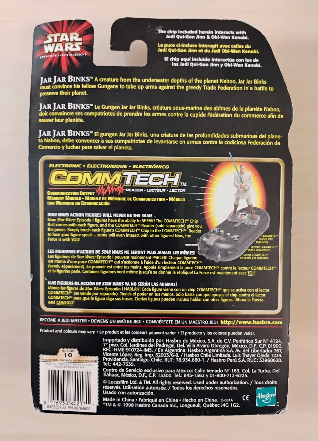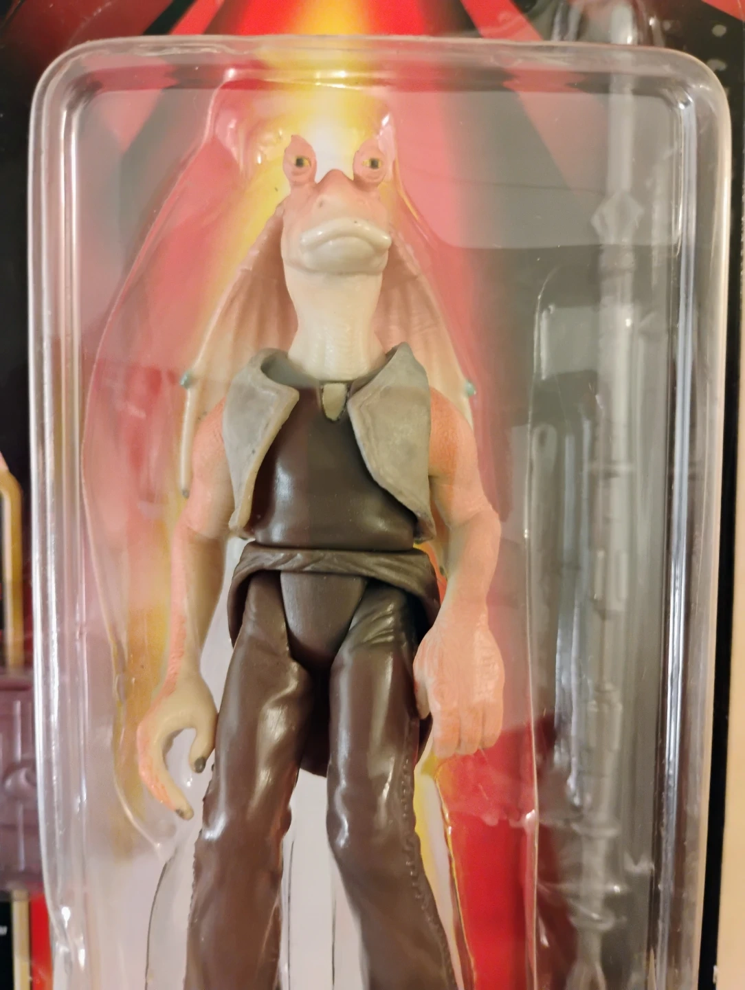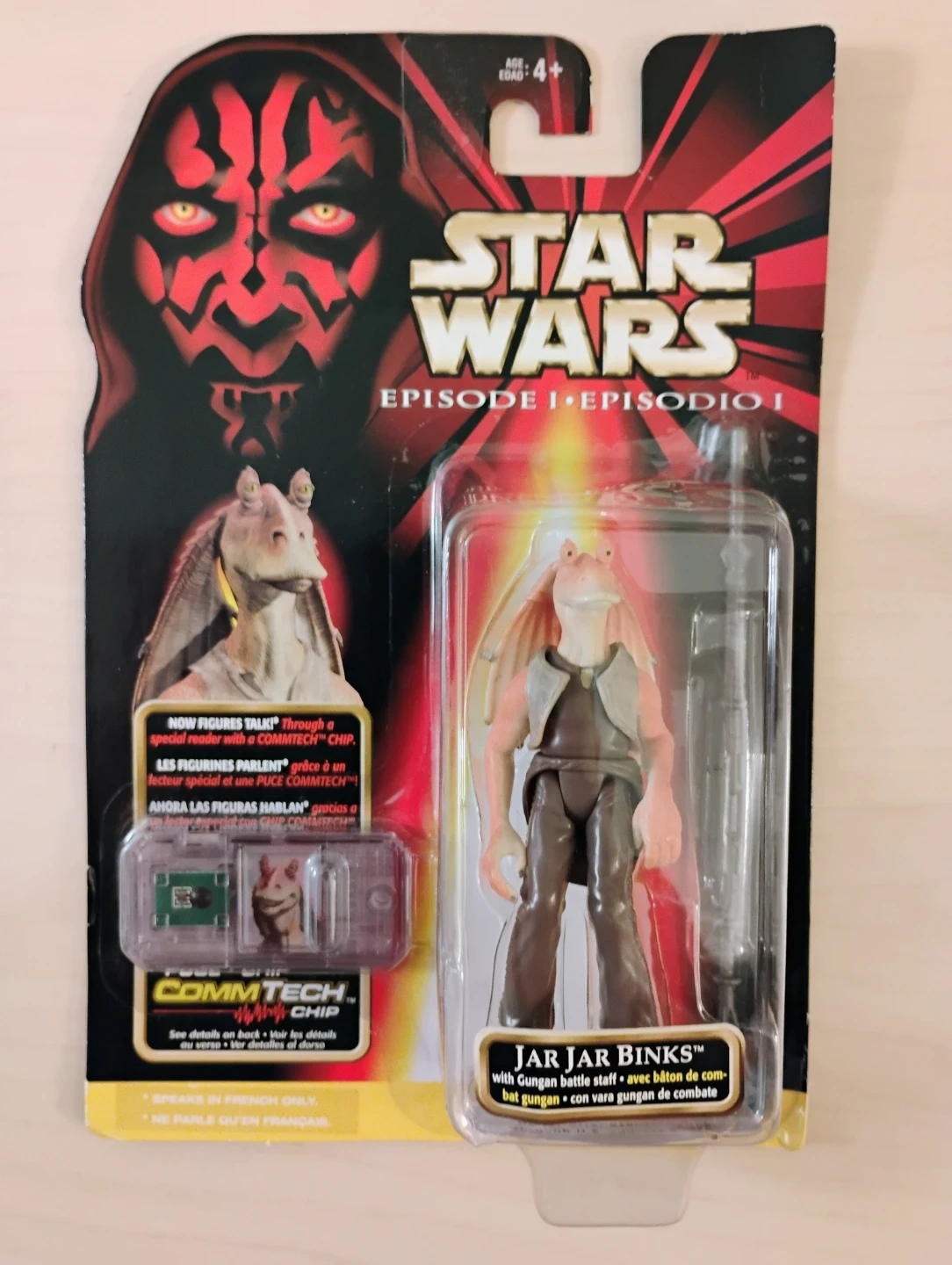 Selling a brand new, in-box Star Wars Episode I Jar Jar Binks action figure! This figure comes with a Gungan battle staff and a CommTech chip. It's still sealed in its original packaging. A great collectible for any Star Wars fan!