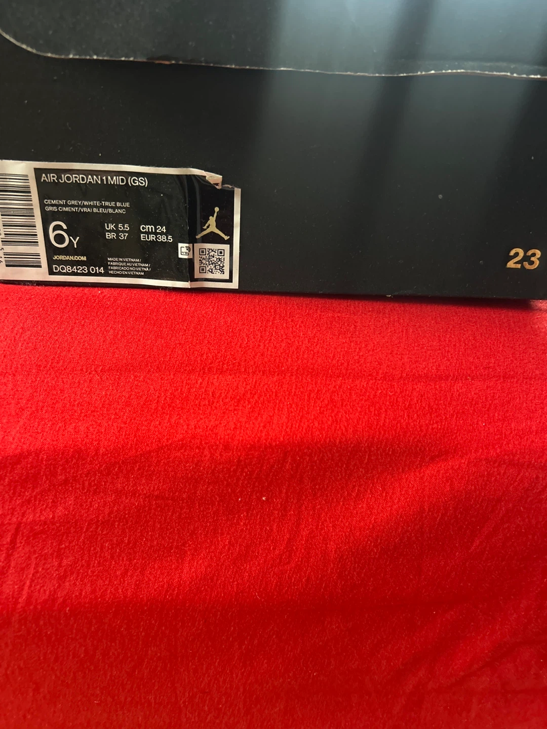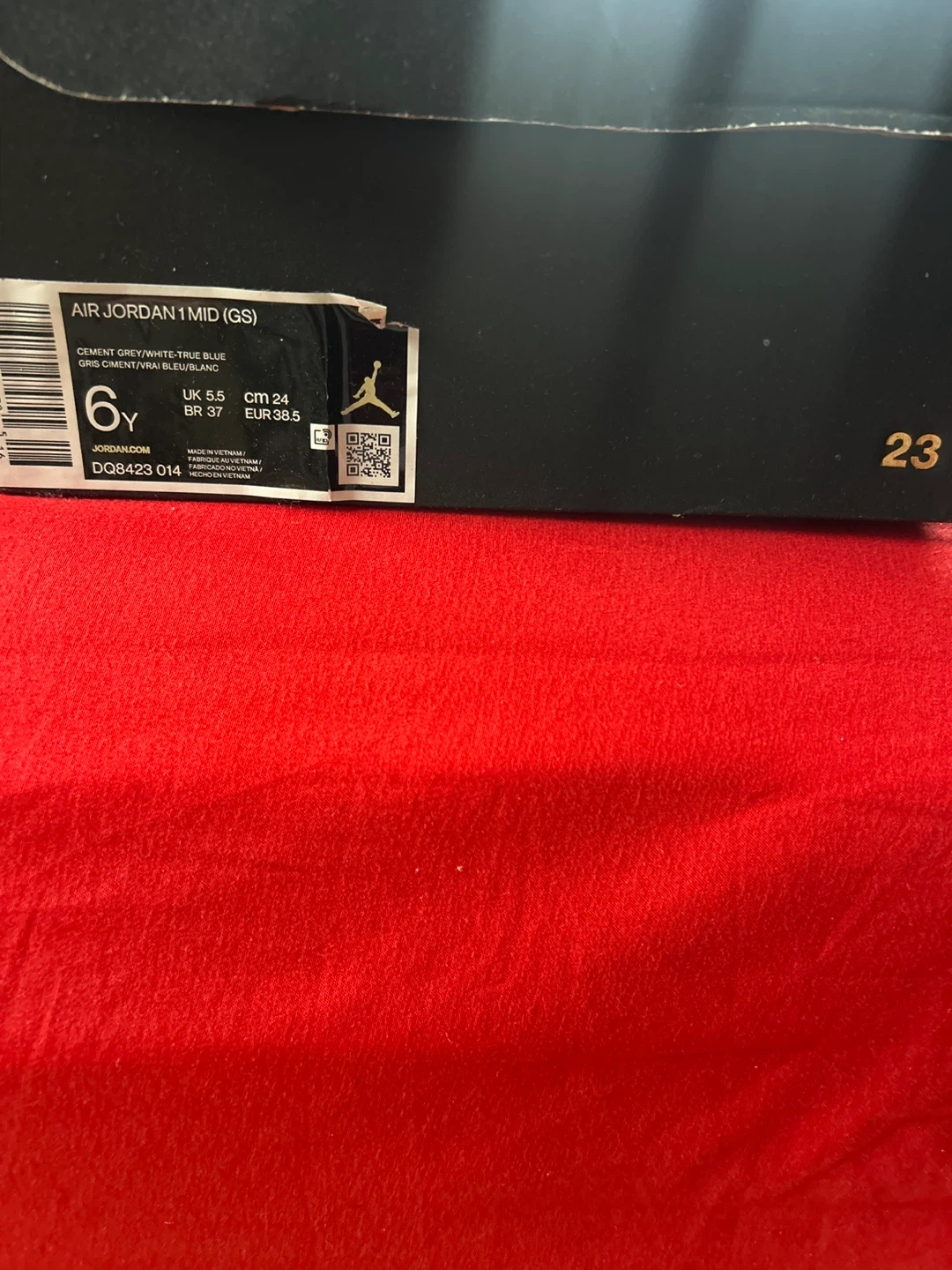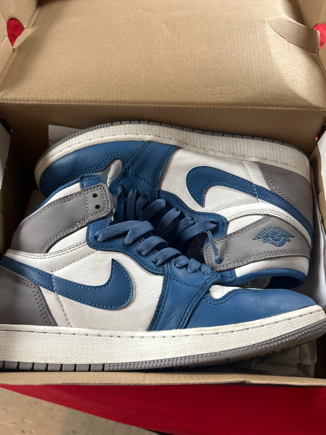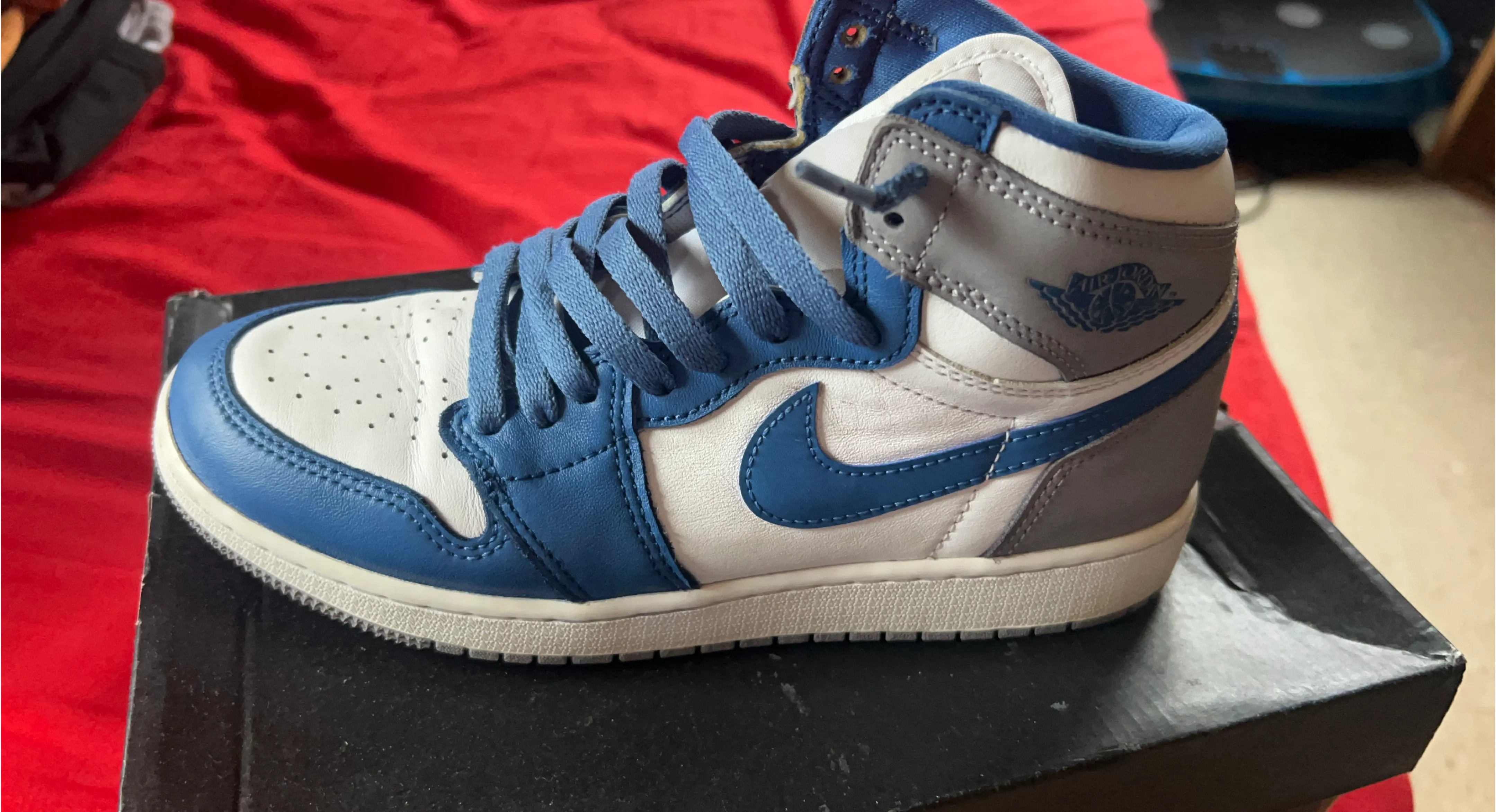 Selling a pair of Air Jordan 1 Mid (GS) sneakers in a Cement Grey/White-True Blue colorway! They are in excellent condition and come with the original box. Size is 6Y.