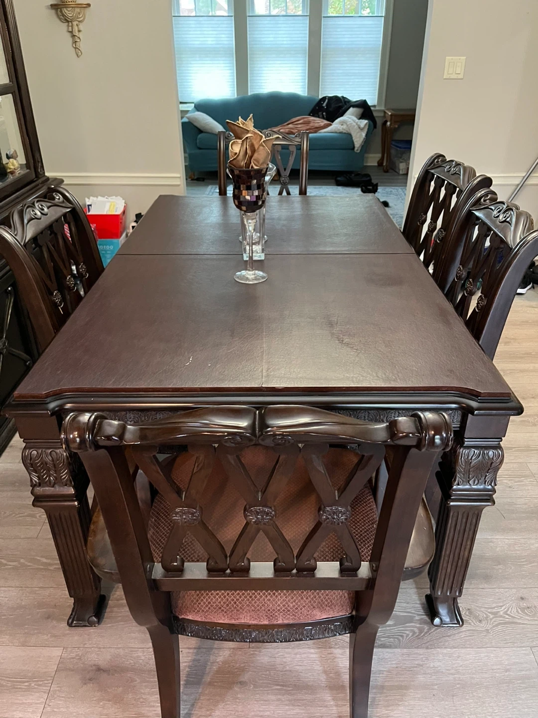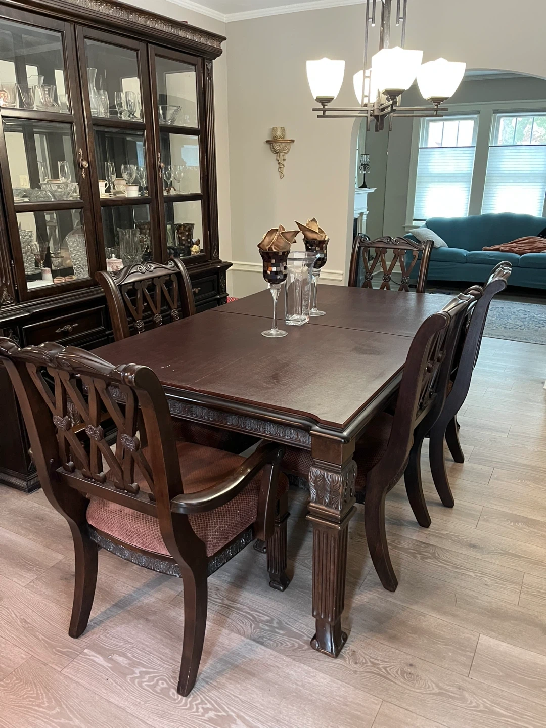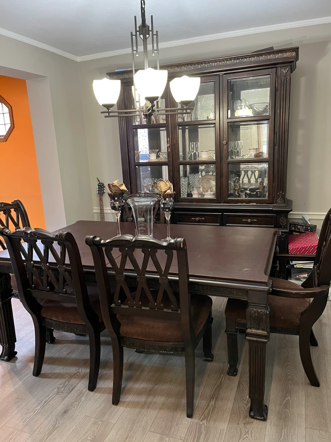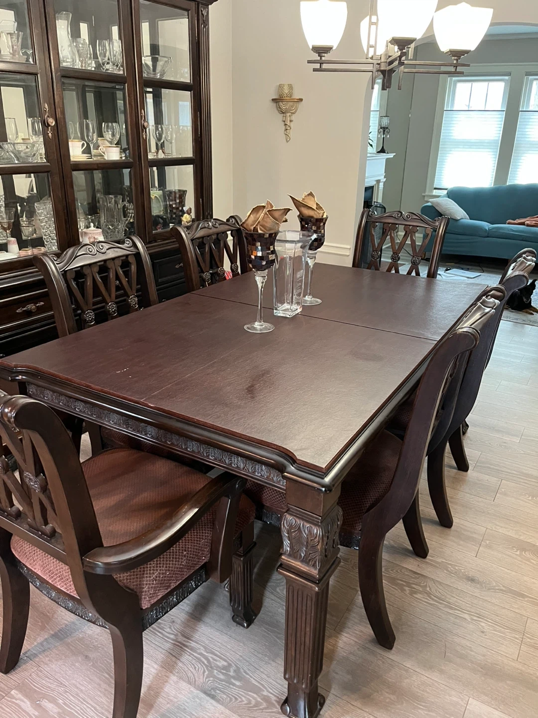 Selling a beautiful dark wood dining table set! It comes with six matching chairs and a hutch for displaying your fine china or glassware. The table has a few minor signs of wear, but overall it's in great condition and ready to be the centerpiece of your dining room