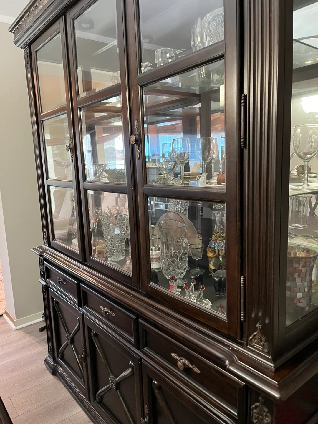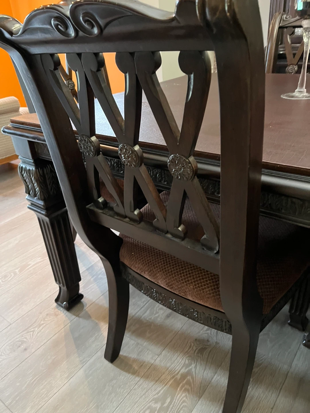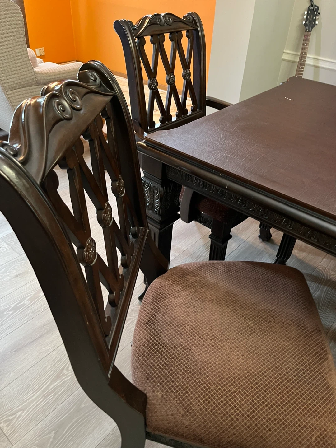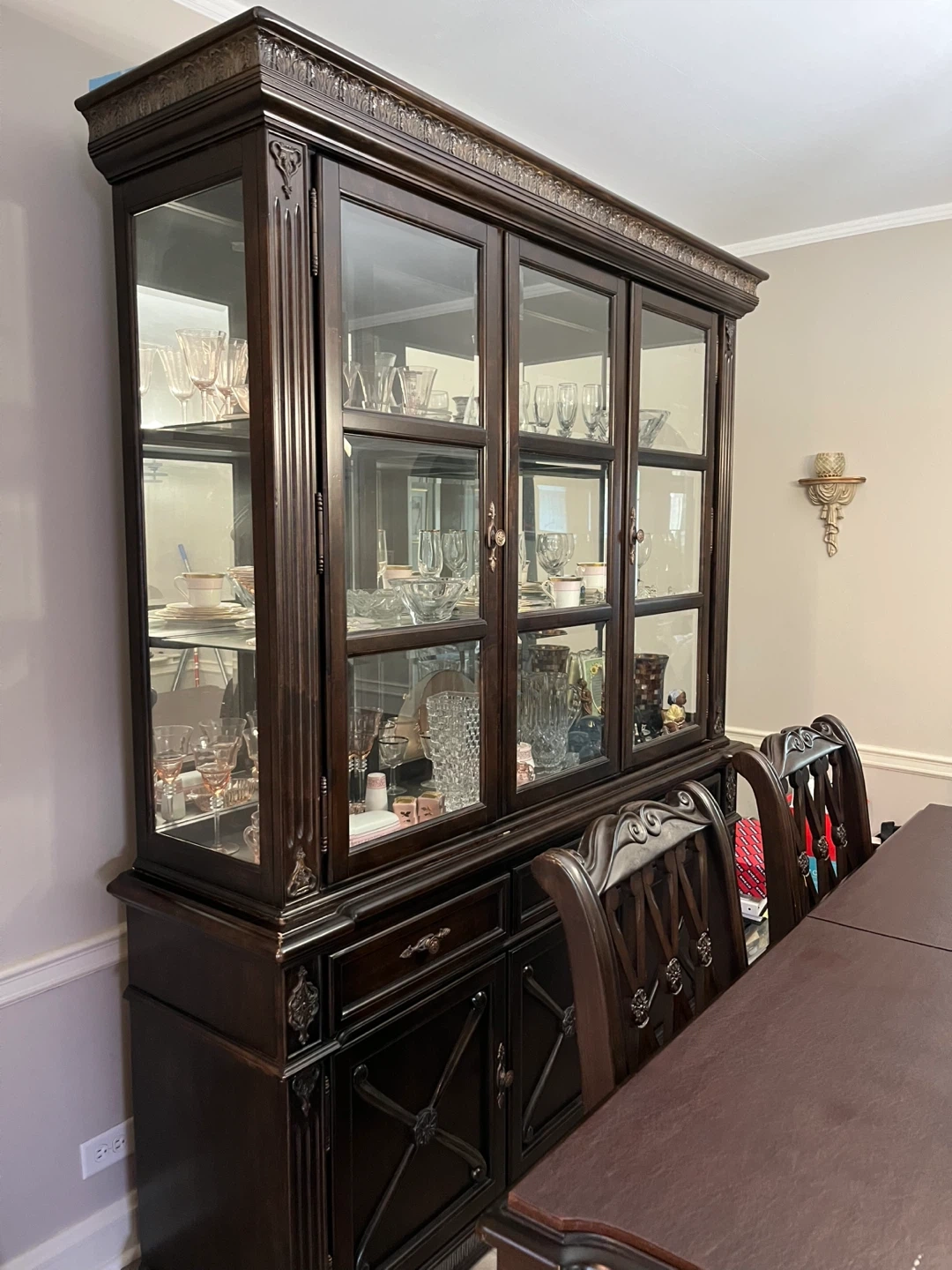 Selling a beautiful dark wood dining table set! It comes with six matching chairs and a hutch for displaying your fine china or glassware. The table has a few minor signs of wear, but overall it's in great condition and ready to be the centerpiece of your dining room