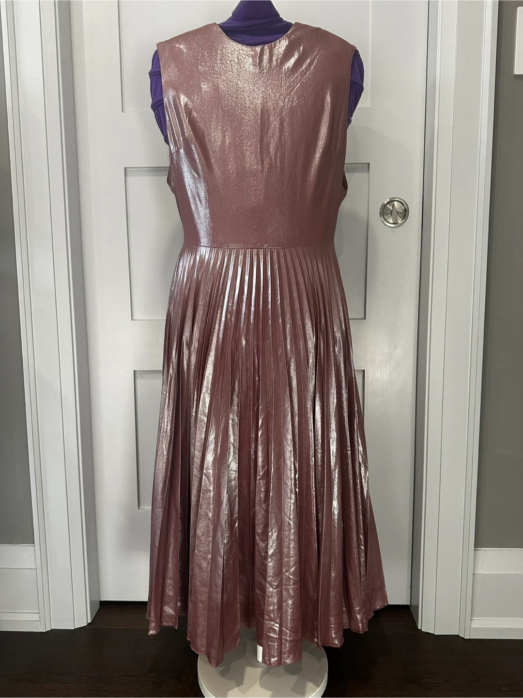 Selling a beautiful Topshop dress with a metallic sheen! It features a pleated skirt and a flattering silhouette. Perfect for a special occasion or a night out