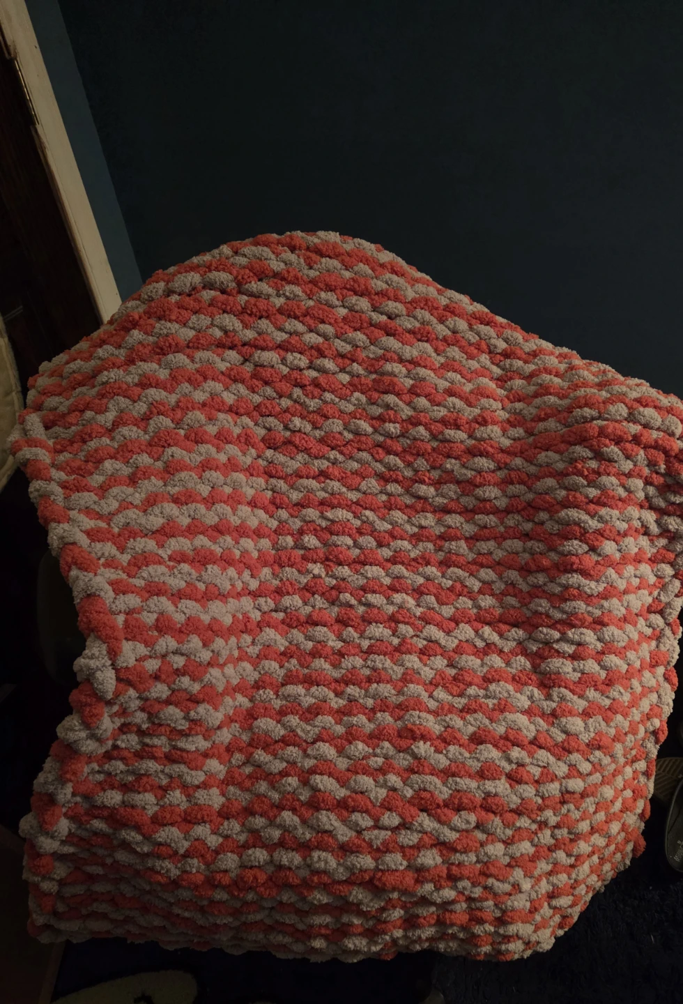Selling a cozy, handmade chunky knit blanket in a lovely coral and gray color combination. It's super soft and perfect for snuggling up on the couch!