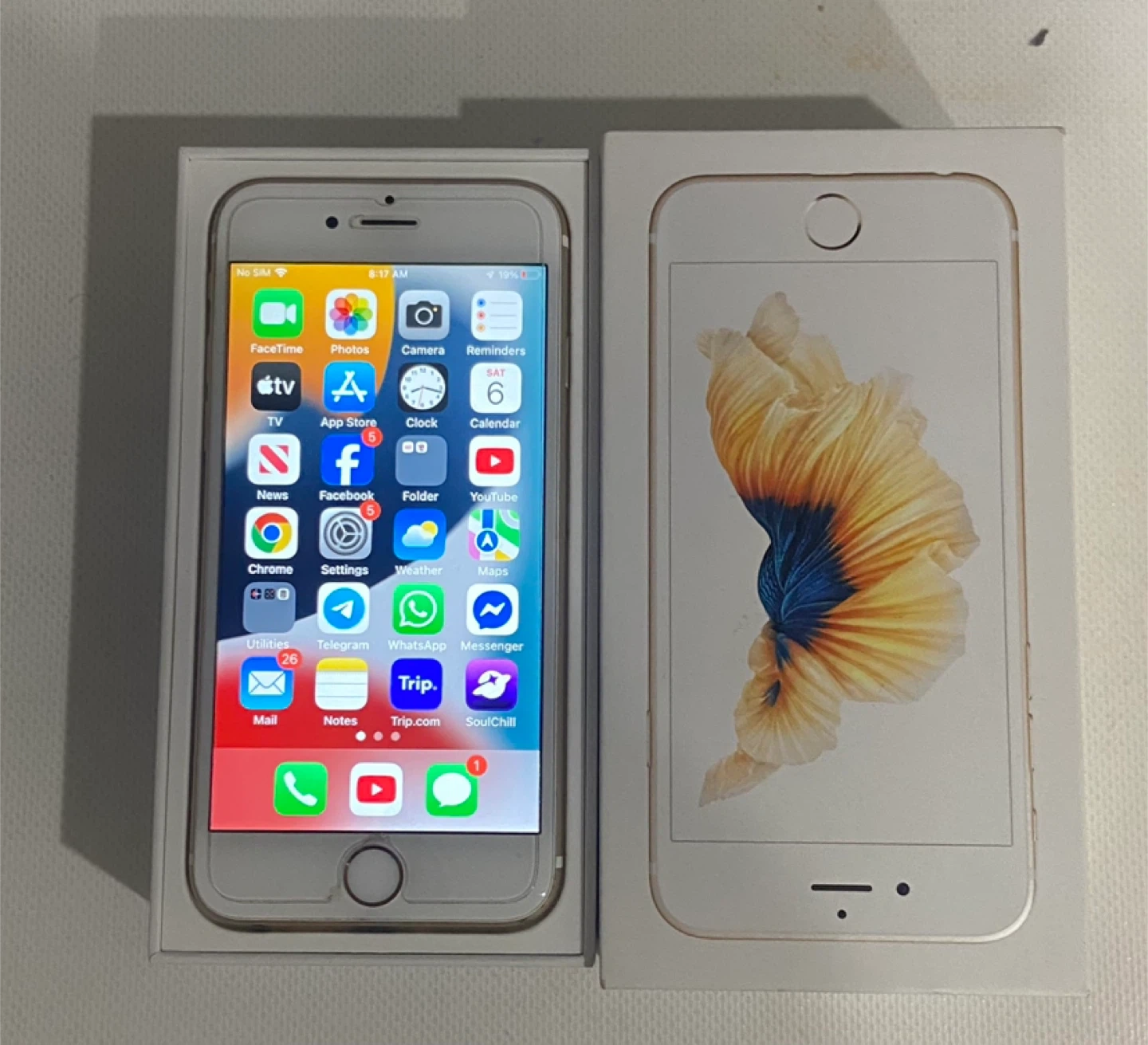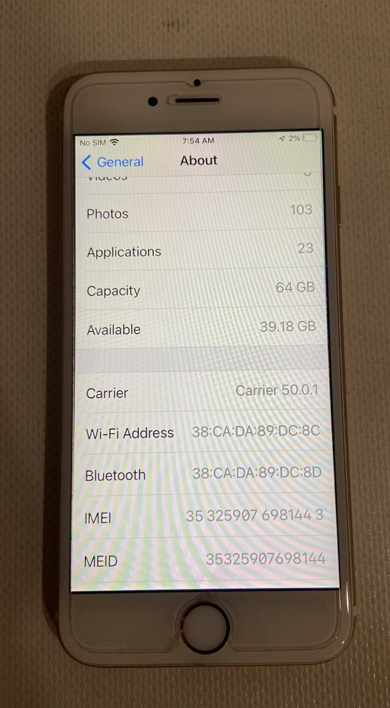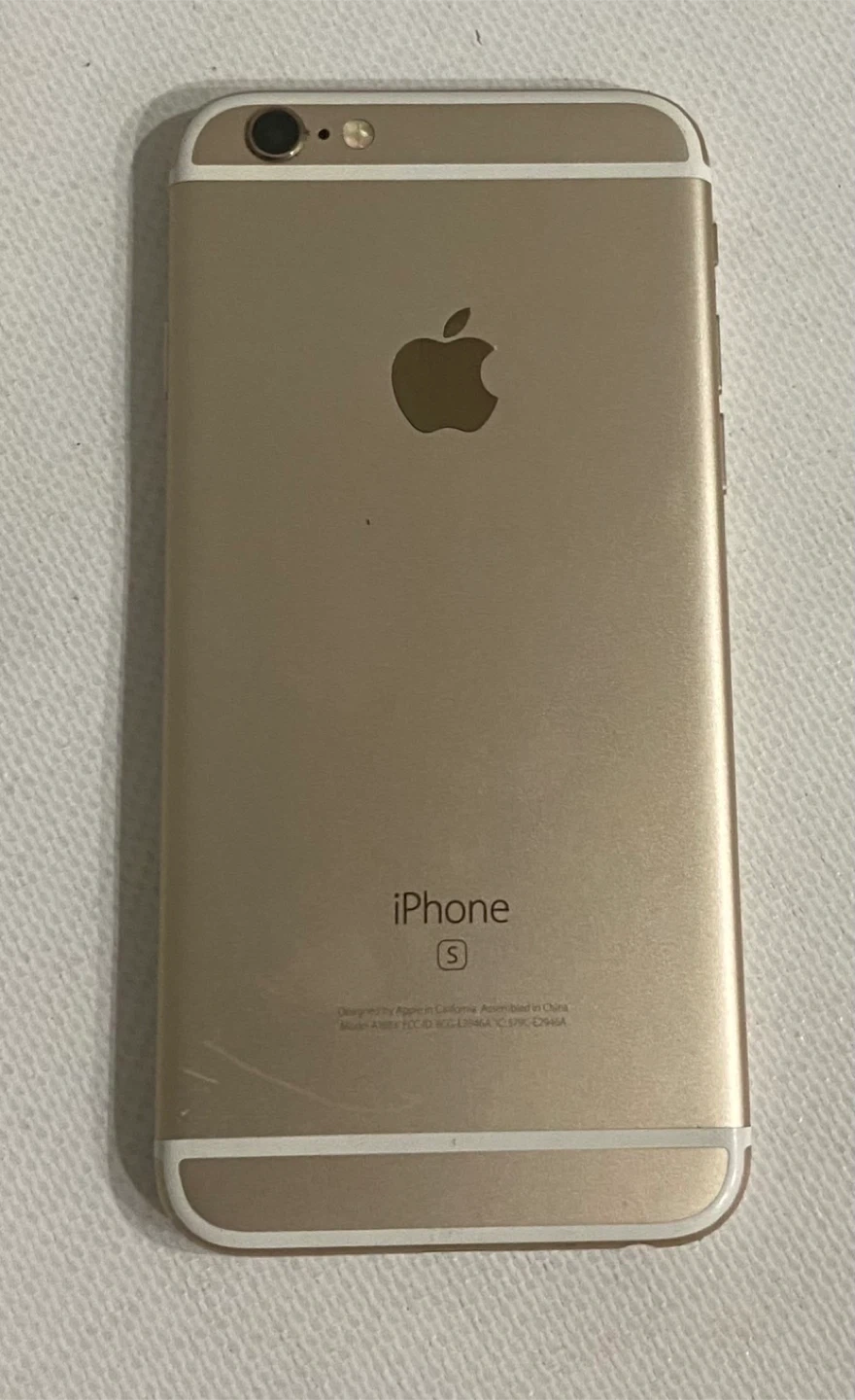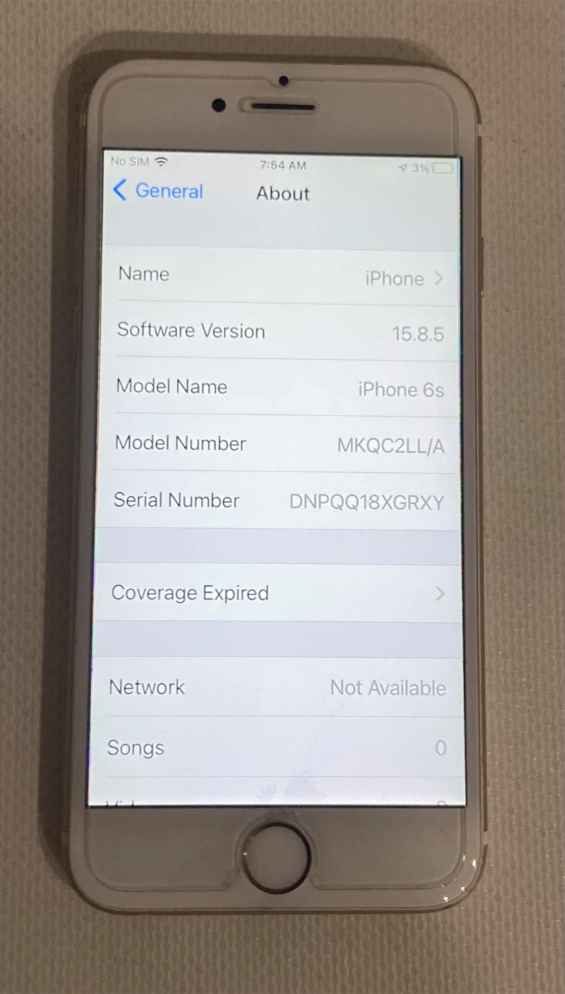Selling a used iPhone 6s in Gold with 64GB of storage. It's in good condition and comes with the original box. The software version is 15.8.5. Model number is MKQC2LL/A.