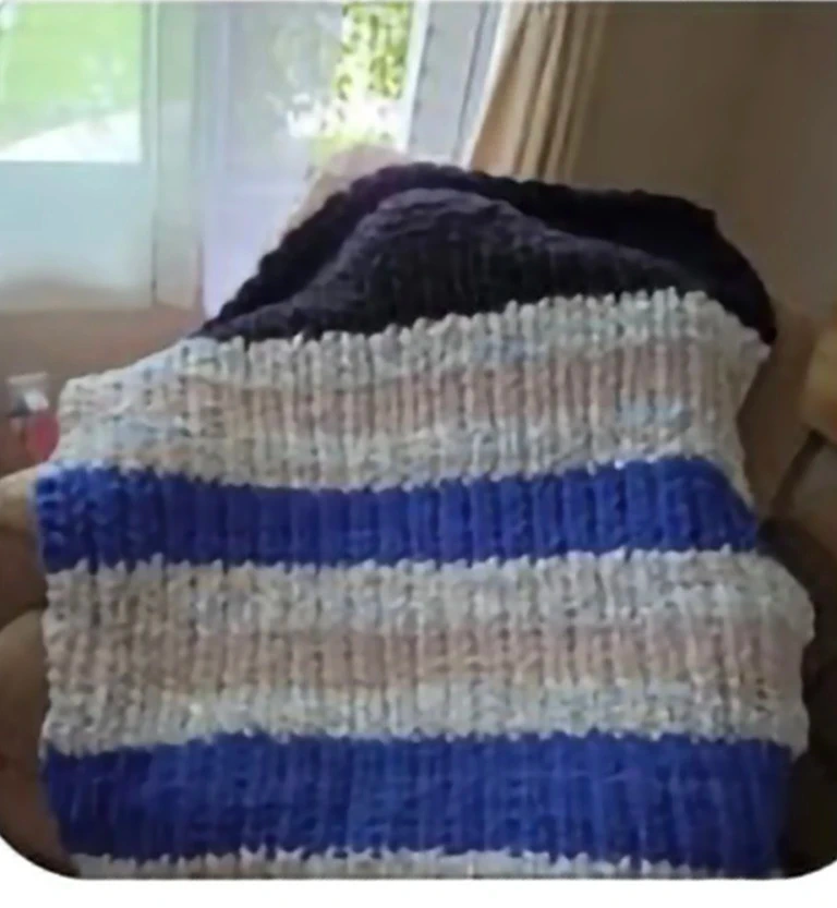 Selling a handmade knitted throw blanket. It features a pattern of blue, white, and black stripes. It's perfect for adding a cozy touch to your living space!